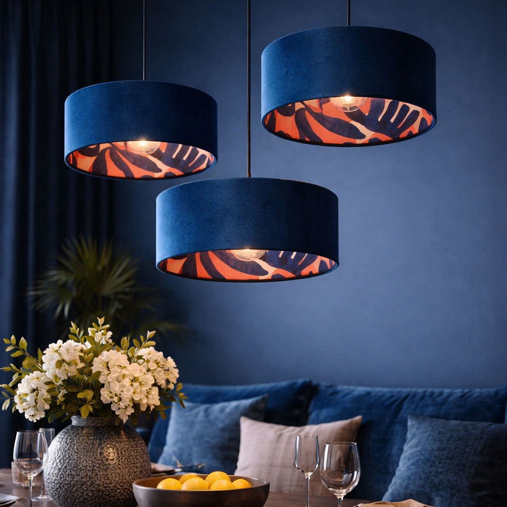 Lampenschirm aus rotem Samt mit tropischem Innenstoff