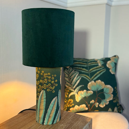 Tischleuchte Samt Sockel Grün – Innen Musterstoff Floral Ginkoblätter