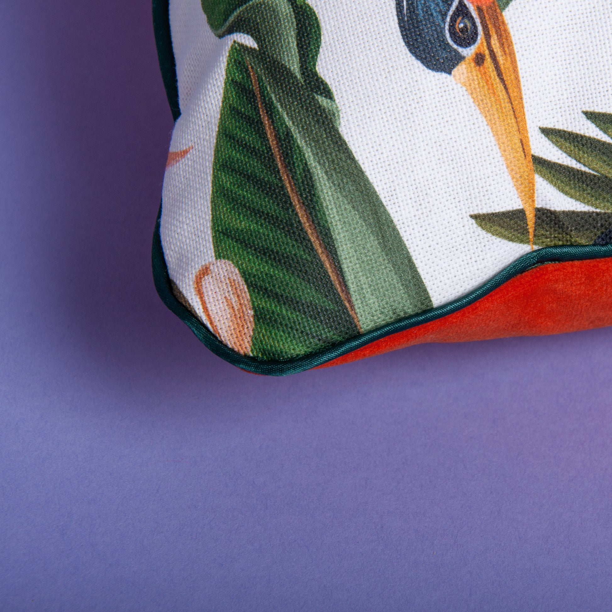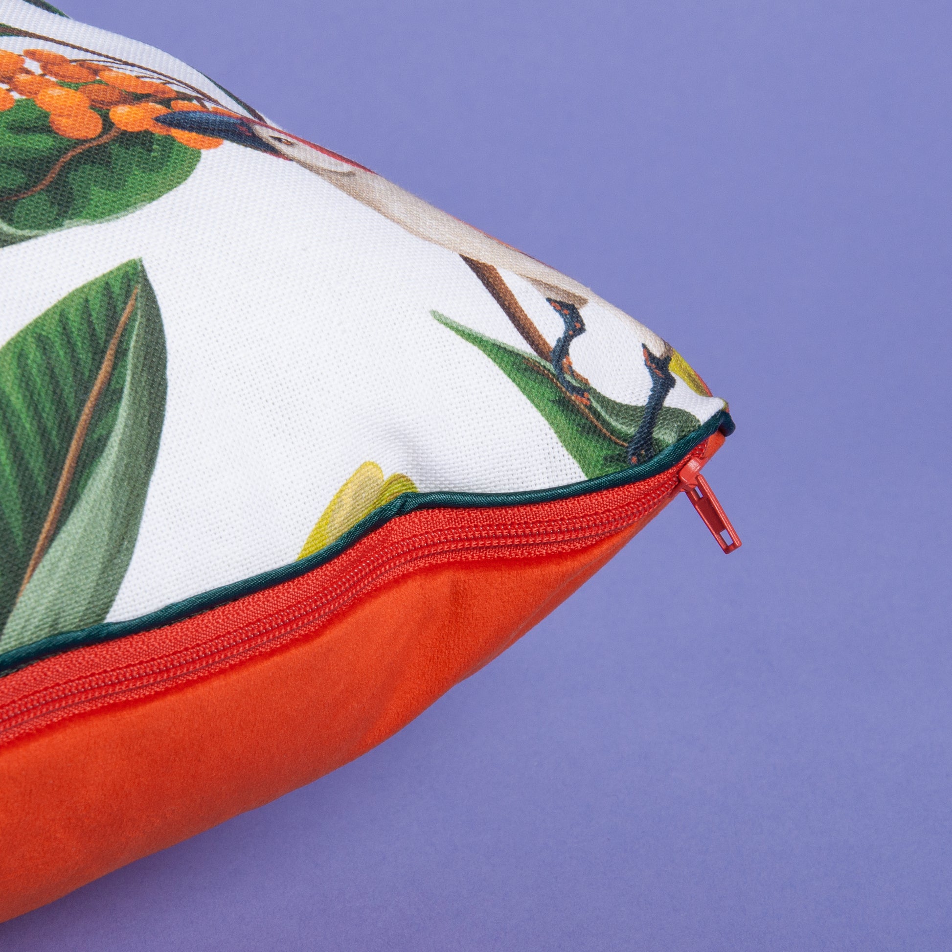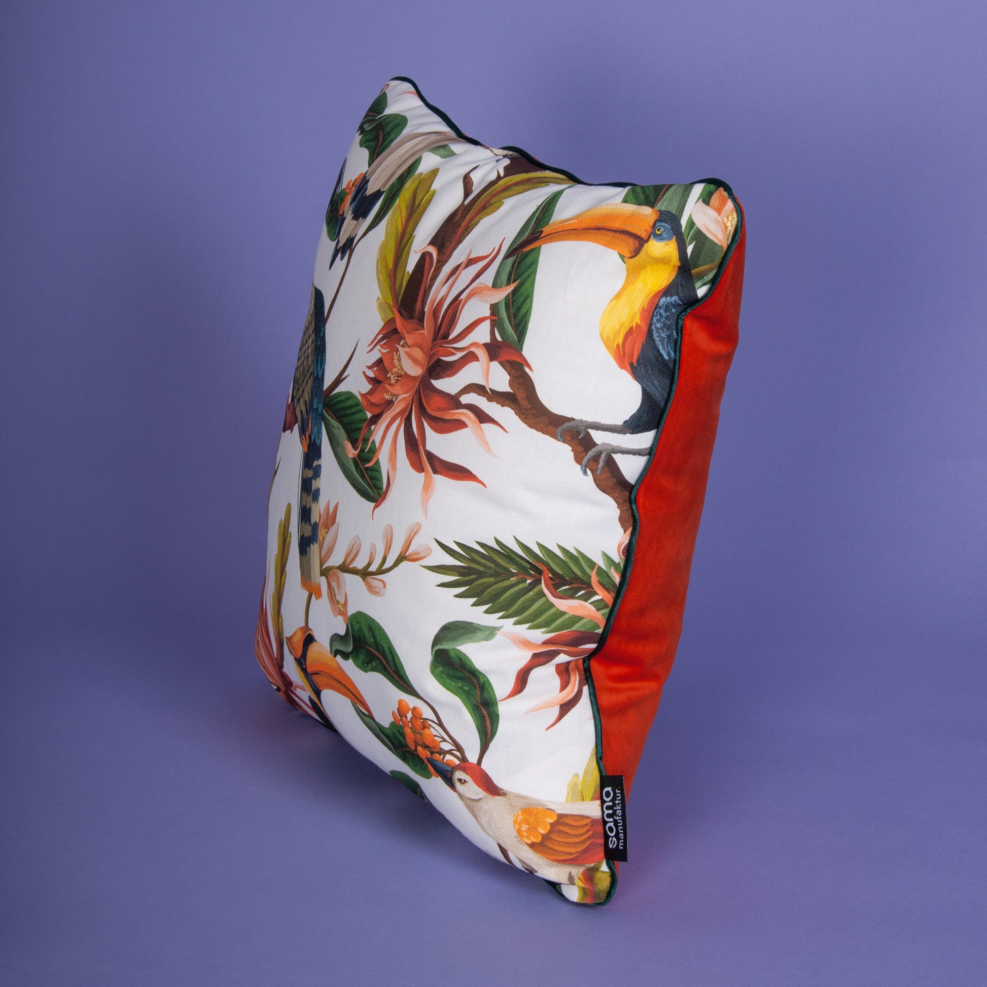 Dekokissen 40 cm x 40 cm Samt Orange, Dschungelmotiv mit Tukans und Blumen