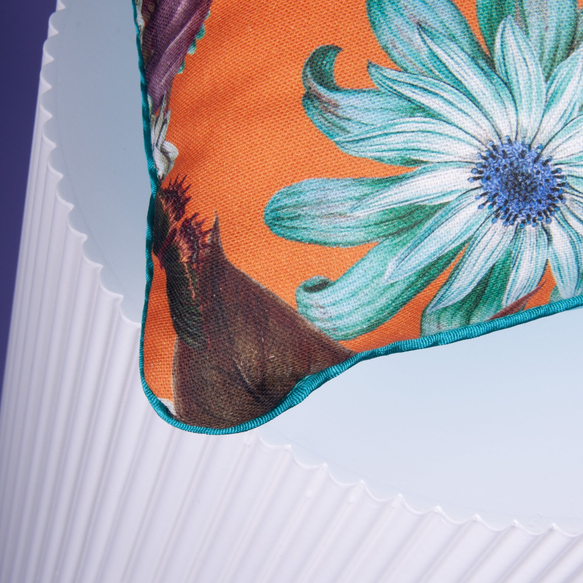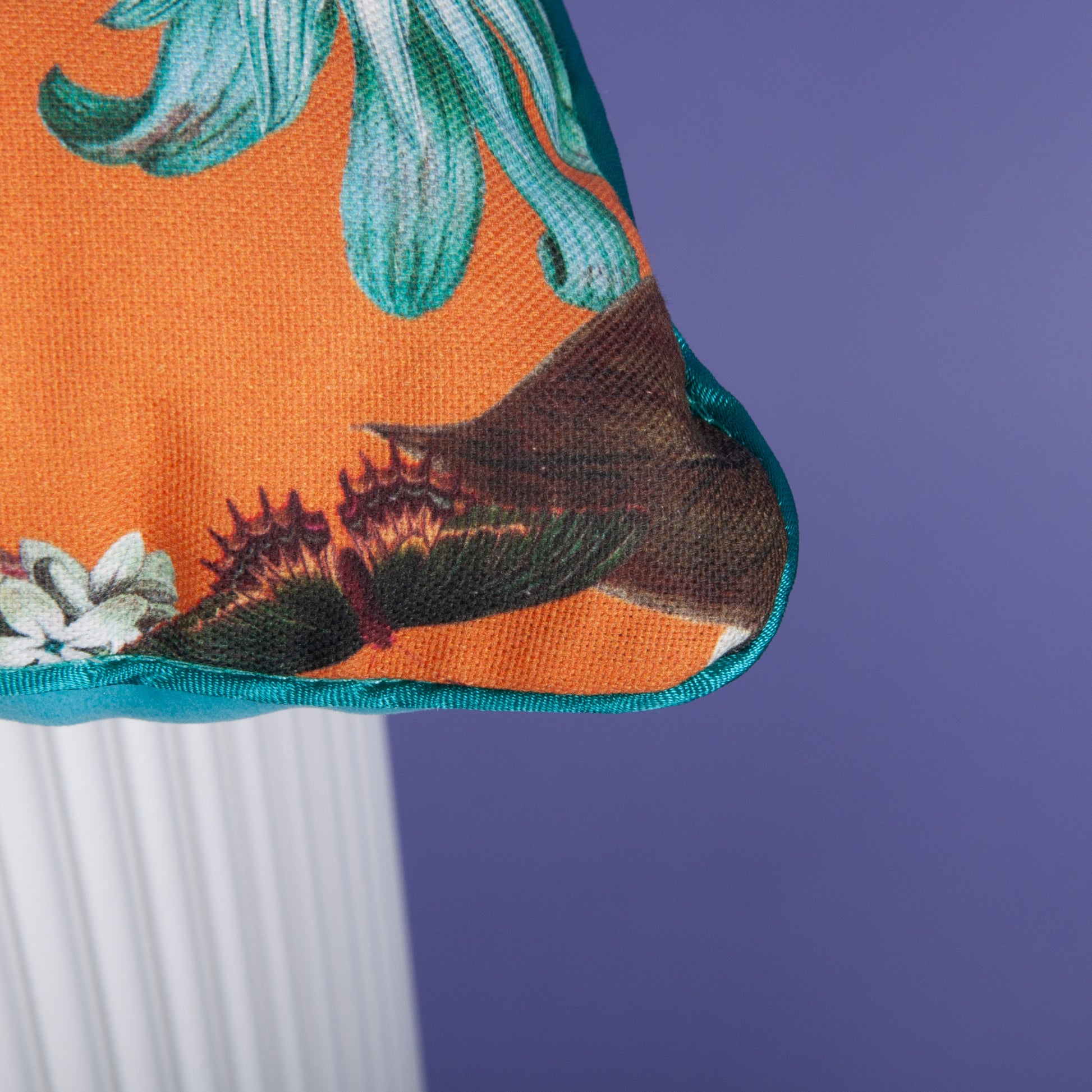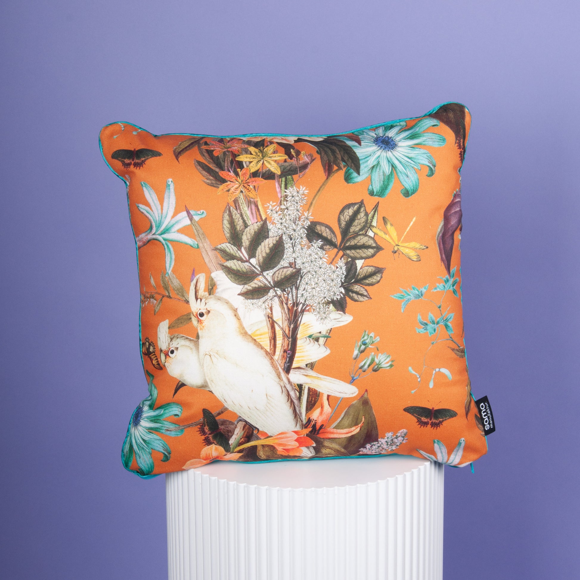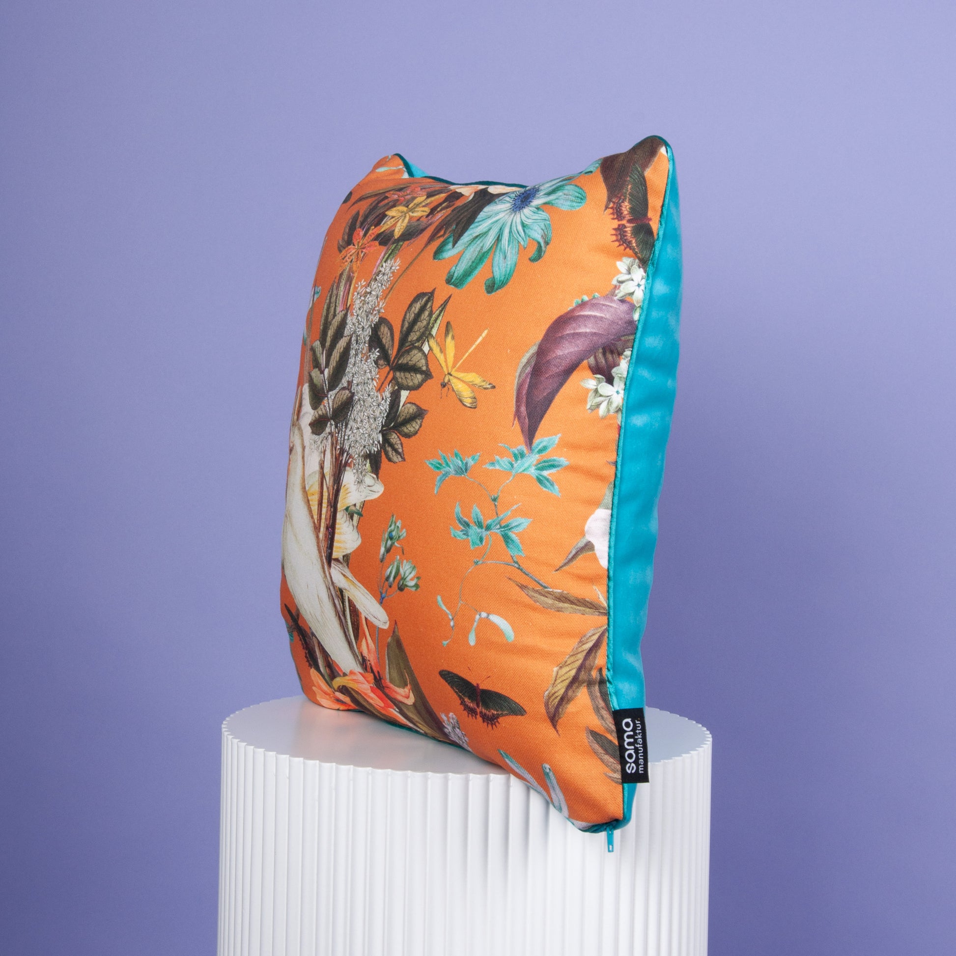 Dieses handgefertigte Dekokissen bringt mit seinem exotischen Papageienmotiv auf leuchtend orangem Baumwollstoff echte Urlaubsstimmung in dein Zuhause. Die Rückseite aus türkisfarbenem Samt sorgt für einen edlen Kontrast und macht das Kissen vielseitig kombinierbar. Ob als Eyecatcher im Wohnzimmer, als fröhlicher Farbtupfer im Schlafzimmer oder in Kombination mit dem passenden Lampenschirm – dieses Kissen verleiht deinem Raum Frische, Lebendigkeit und einen Hauch von tropischem Flair.