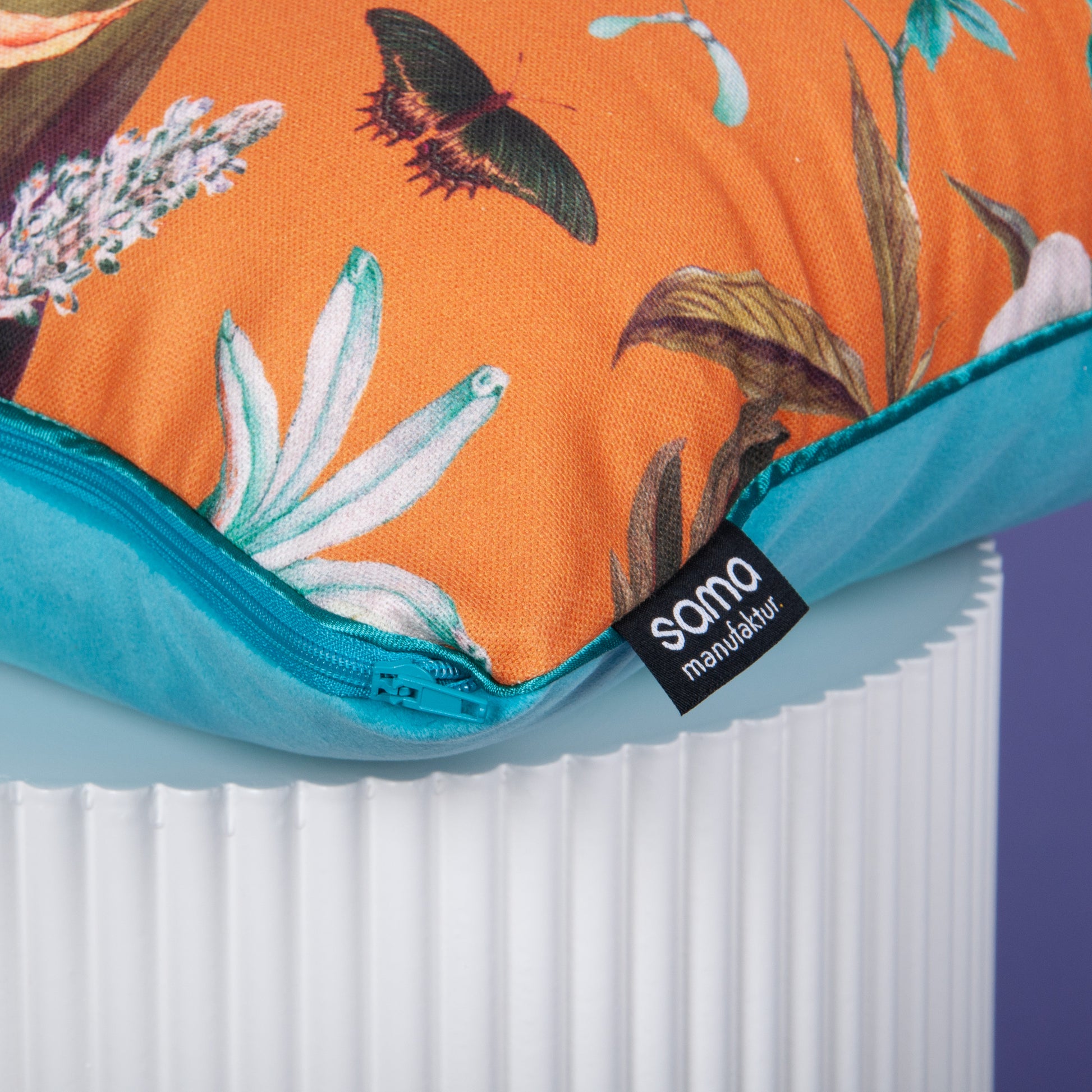 Dekokissen 40 x 40 cm Baumwolle Papageien, Rückseite Samt türkies