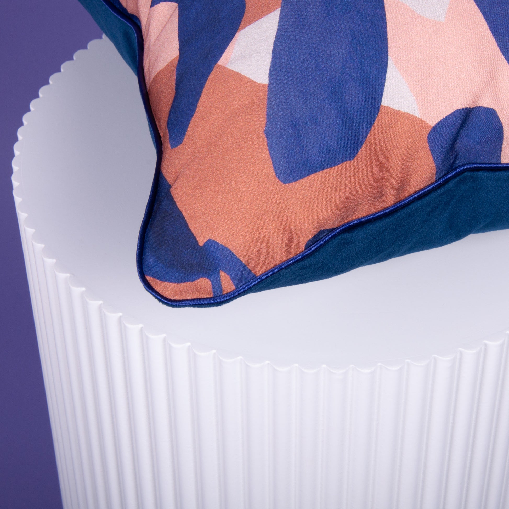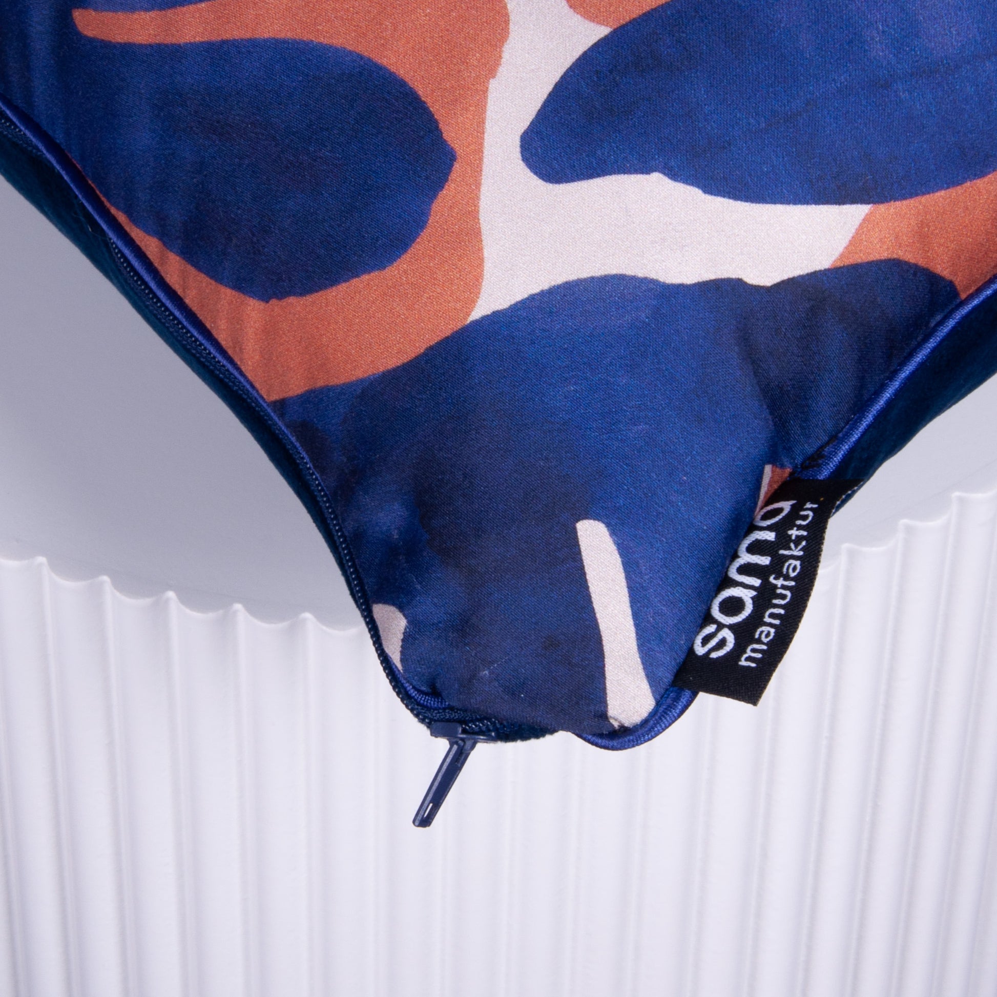Dieses handgefertigte Dekokissen besticht durch seinen abstrakten Baumwollstoff in warmem Rost- und Roséton mit tiefblauen Blattformen auf der Vorderseite und edlem Samt in Dunkelblau auf der Rückseite. Die kräftige Farbkombination wirkt modern, kunstvoll und bringt sofort Lebendigkeit in dein Zuhause. Ob auf dem Sofa, im Schlafzimmer oder kombiniert mit dem passenden Lampenschirm – dieses Kissen setzt einen eleganten, farbintensiven Akzent und macht jeden Raum gemütlicher und stilvoller.