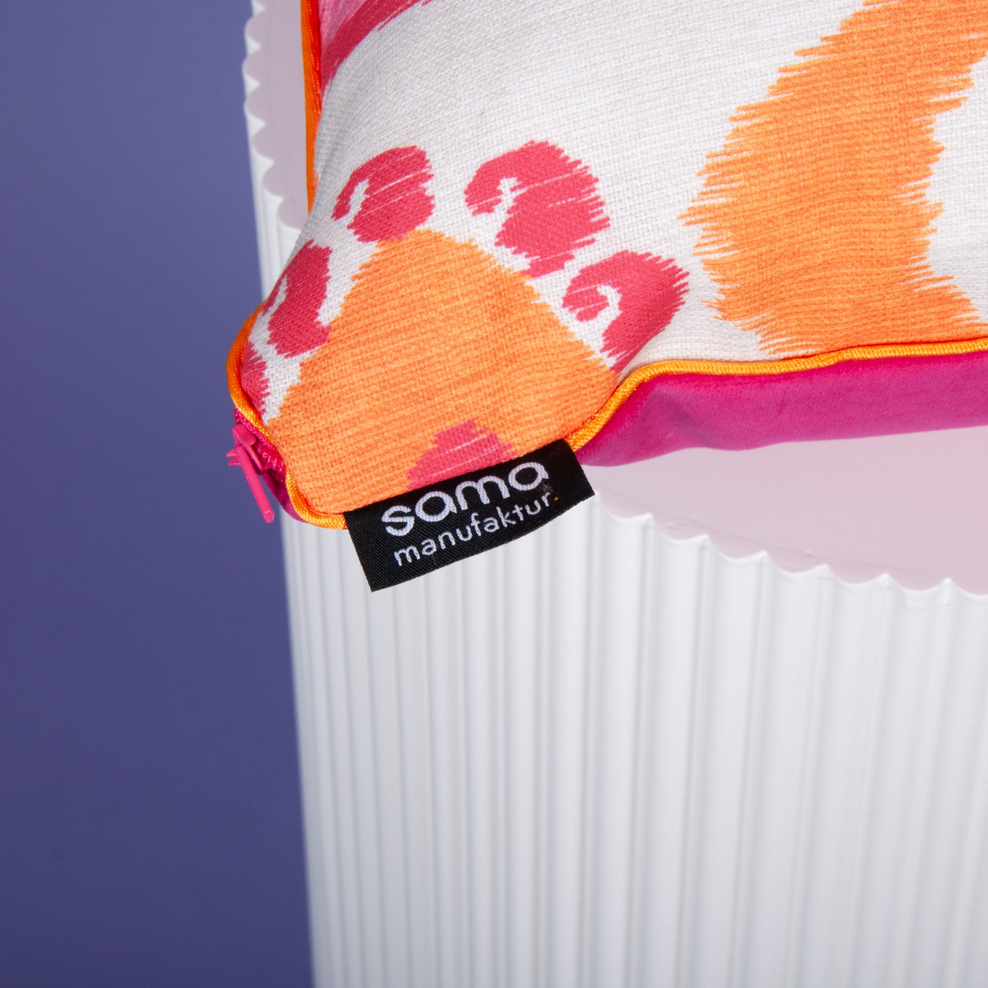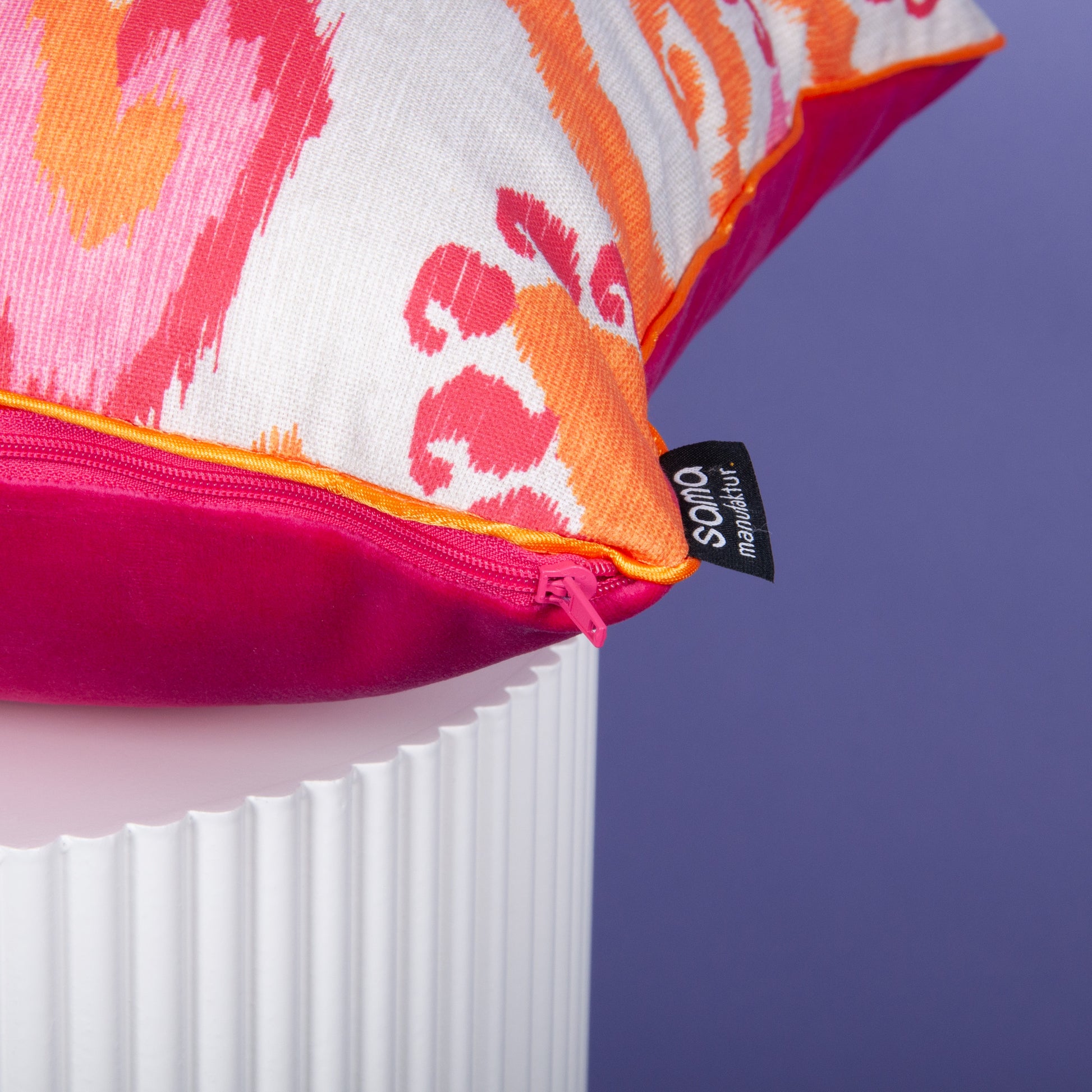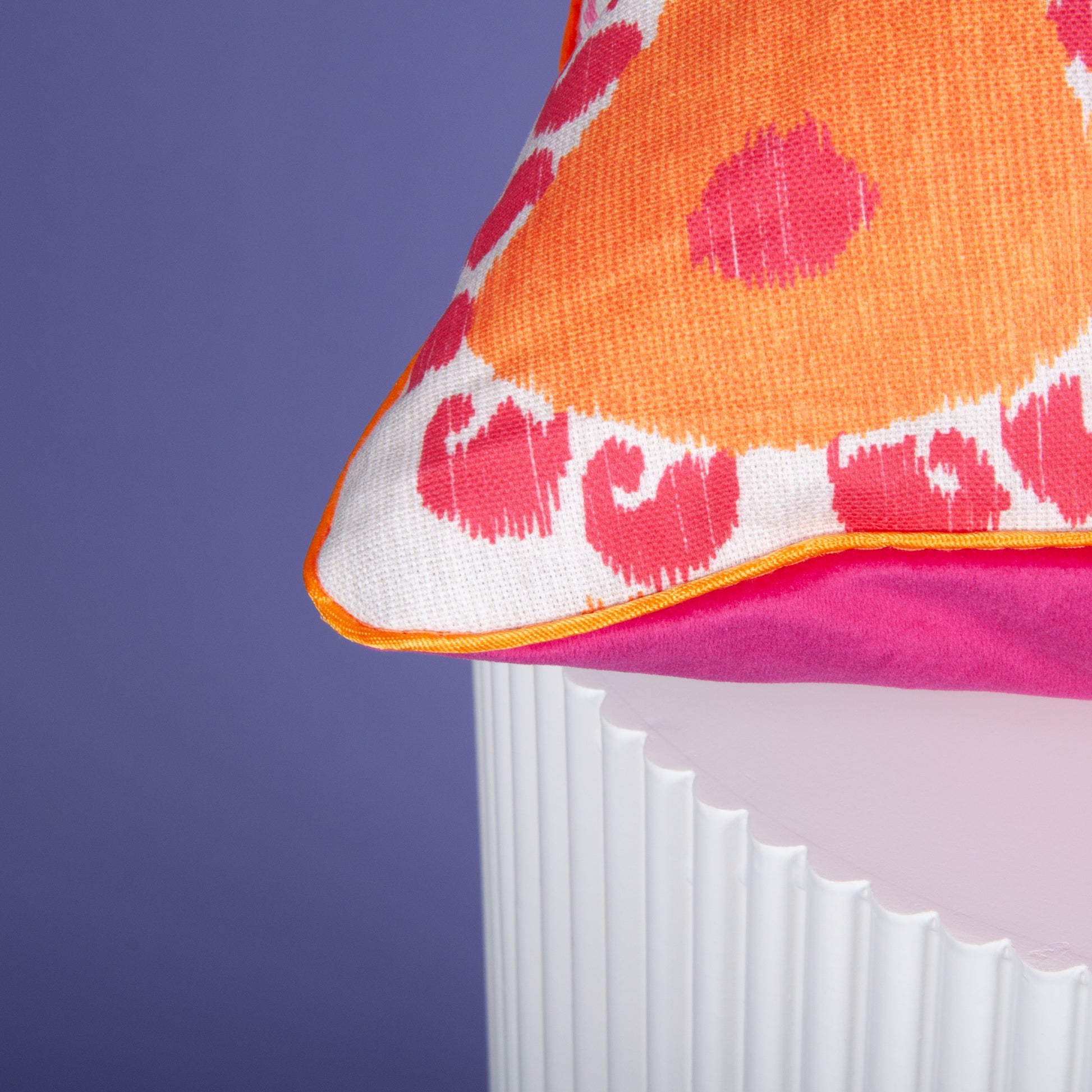 Dieses handgefertigte Dekokissen kombiniert einen farbenfrohen Ikat-Baumwollstoff in Pink und Orange mit einer Rückseite aus edlem Samt. Die kräftigen Farben bringen Lebendigkeit und Wärme in dein Zuhause, während die Materialmischung für spannende Kontraste sorgt. Ob im Wohnzimmer, Schlafzimmer oder als Dekoelement im Flur – dieses Kissen setzt einen ausdrucksstarken Akzent und passt perfekt zu modernen, Boho- oder eklektischen Einrichtungsstilen.