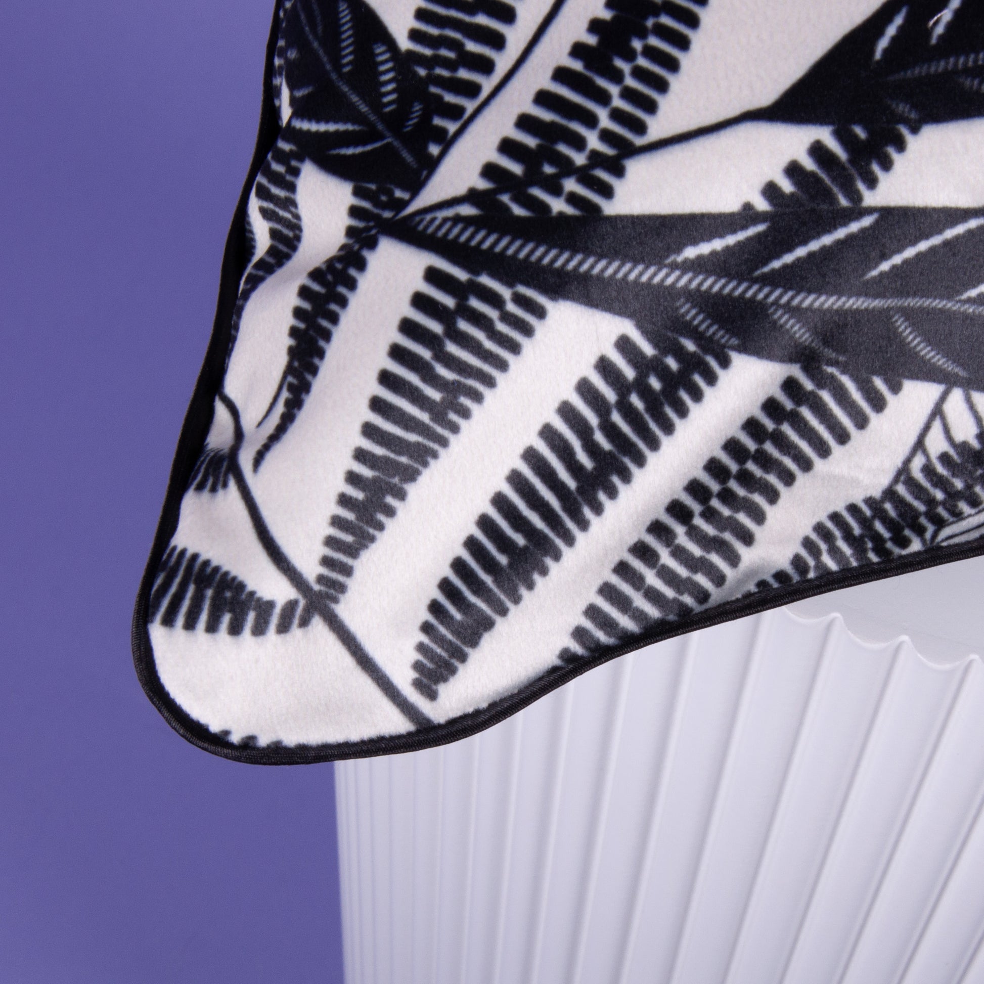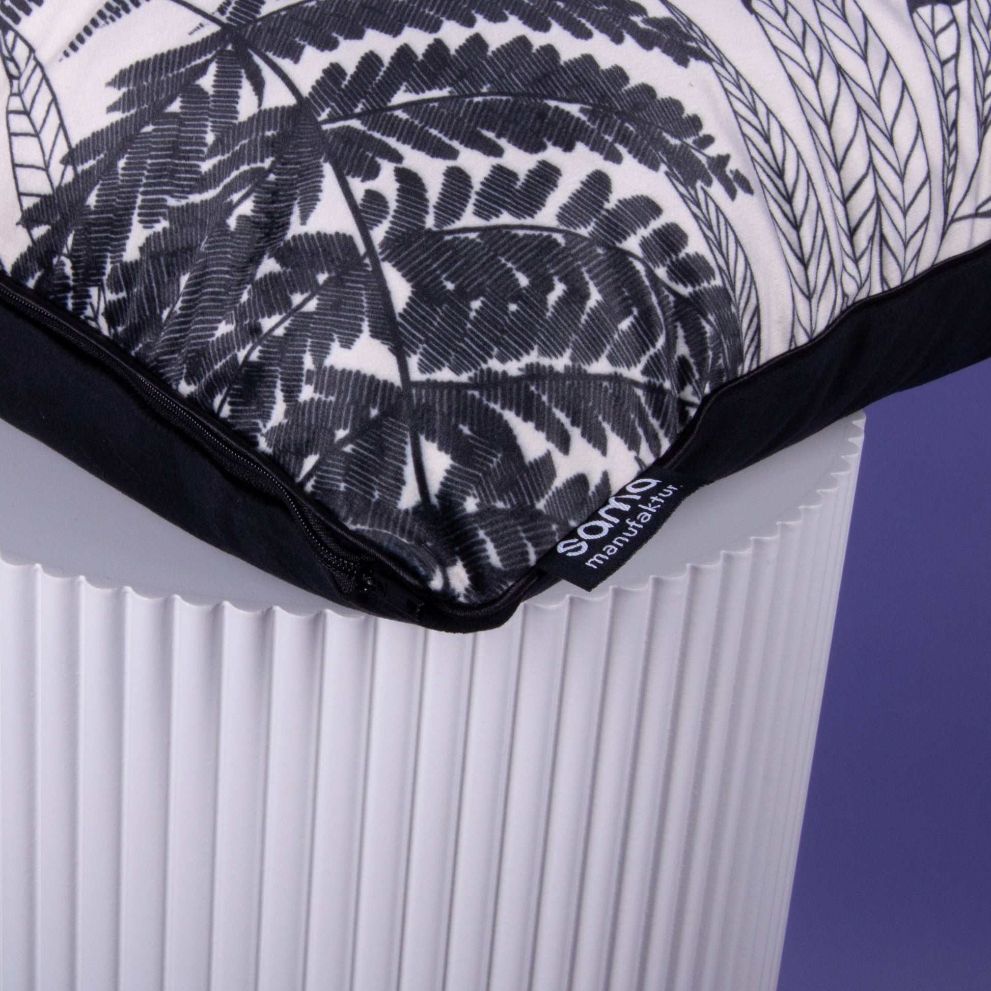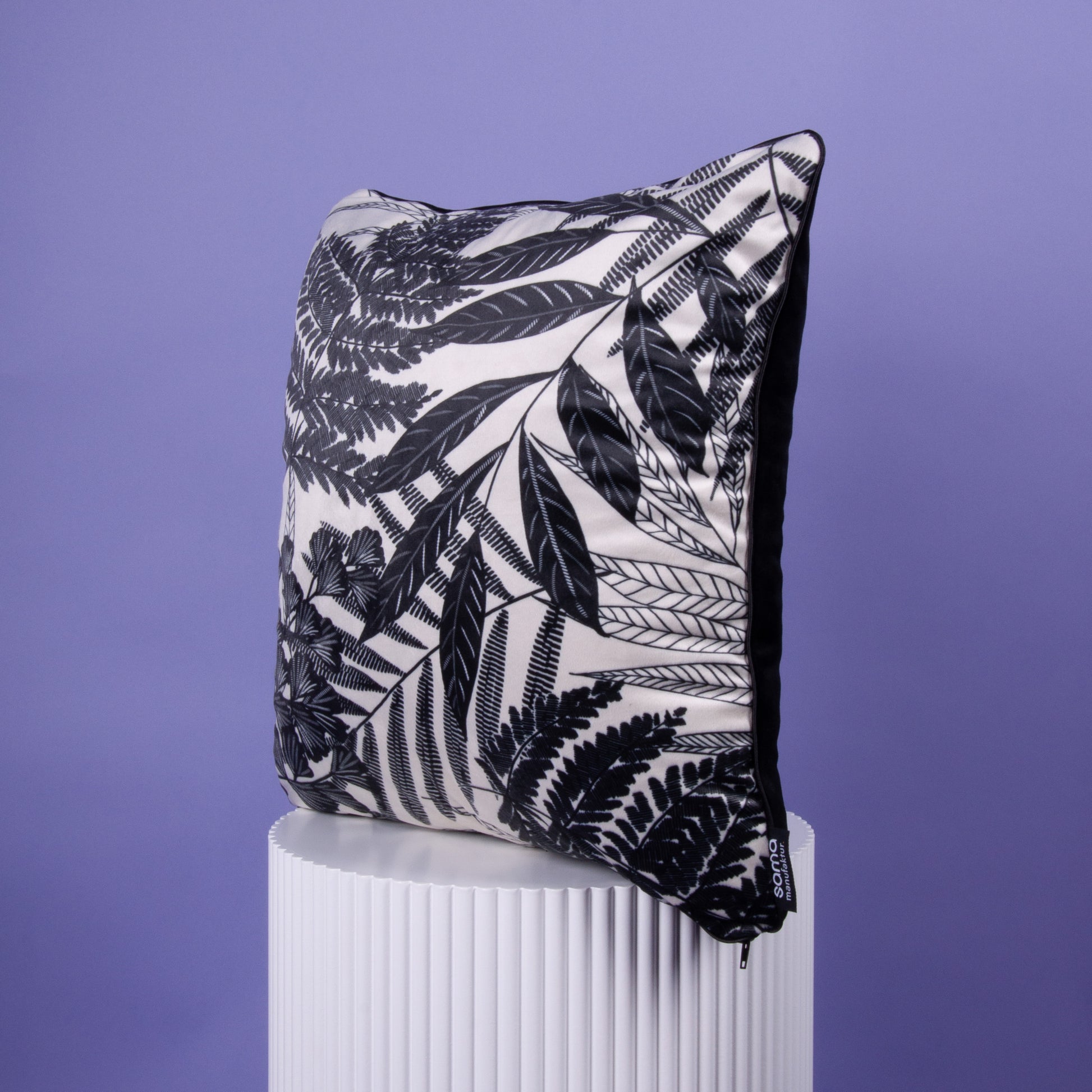 Dekokissen 40 x 40 cm Samt Schwarz weiß Blätter, Rückseite Samt Schwarz