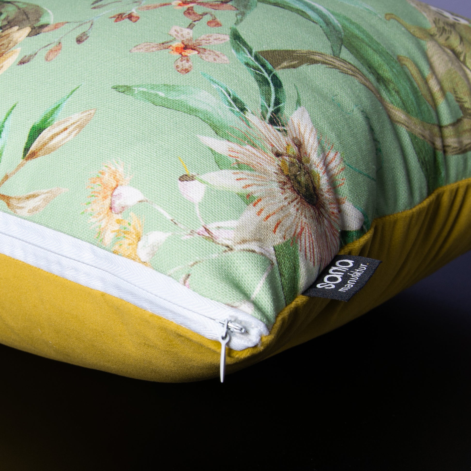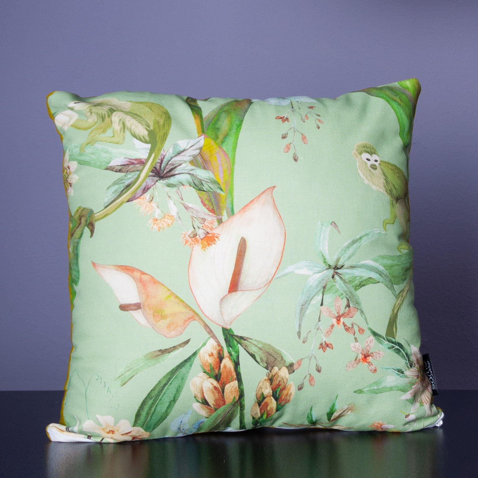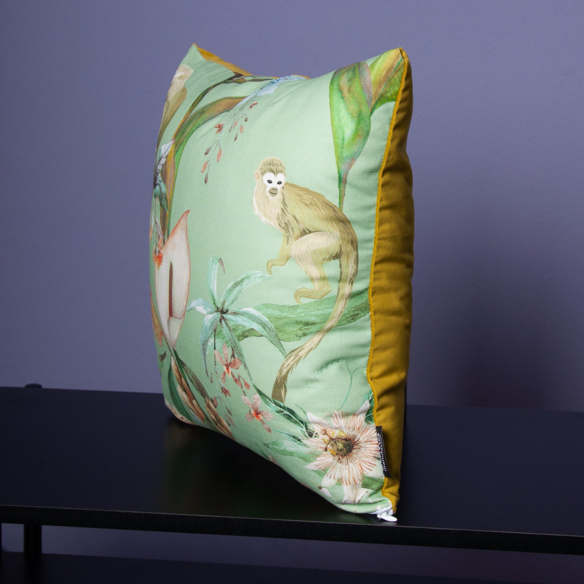 Dekokissen 40 x 40 cm Stoff Baumwollstoff Dschungel Tropisch Affen, Rückseite grüngelber Samt
