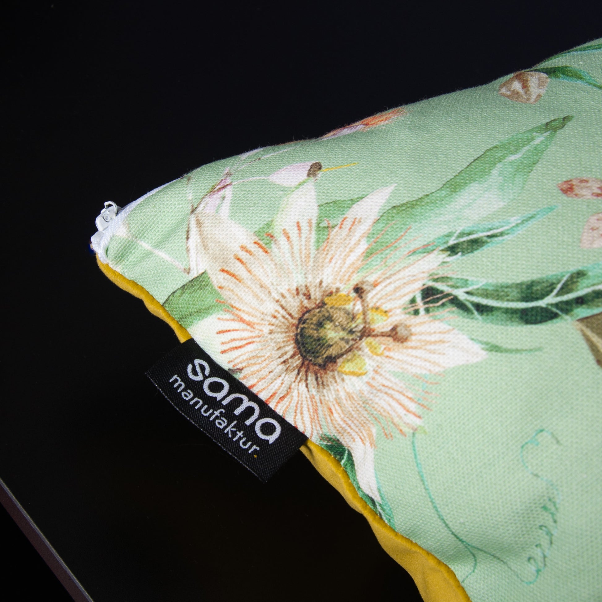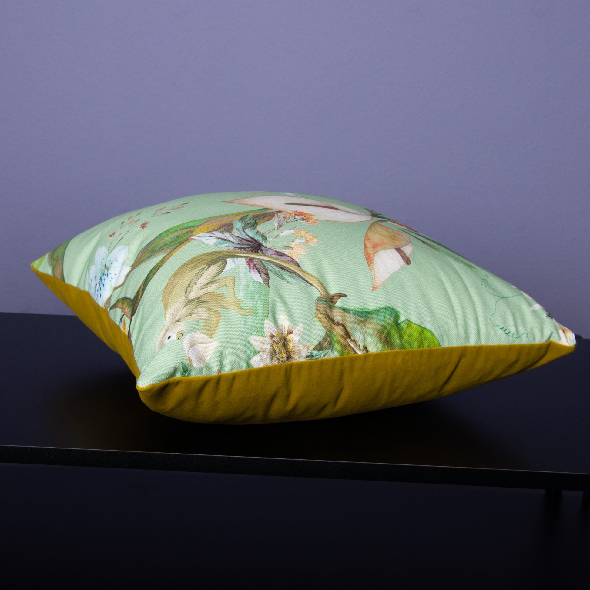 Die Rückseite aus edlem Samt in einem warmen Gelbton ergänzt das Design und macht das Kissen noch wandelbarer. Ein hochwertiges Wohnaccessoire für alle, die Farbe lieben und mit ihrer Einrichtung ein Statement setzen möchten.