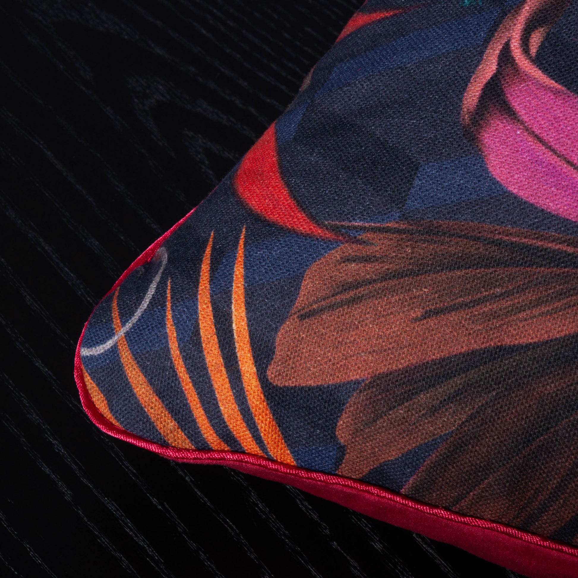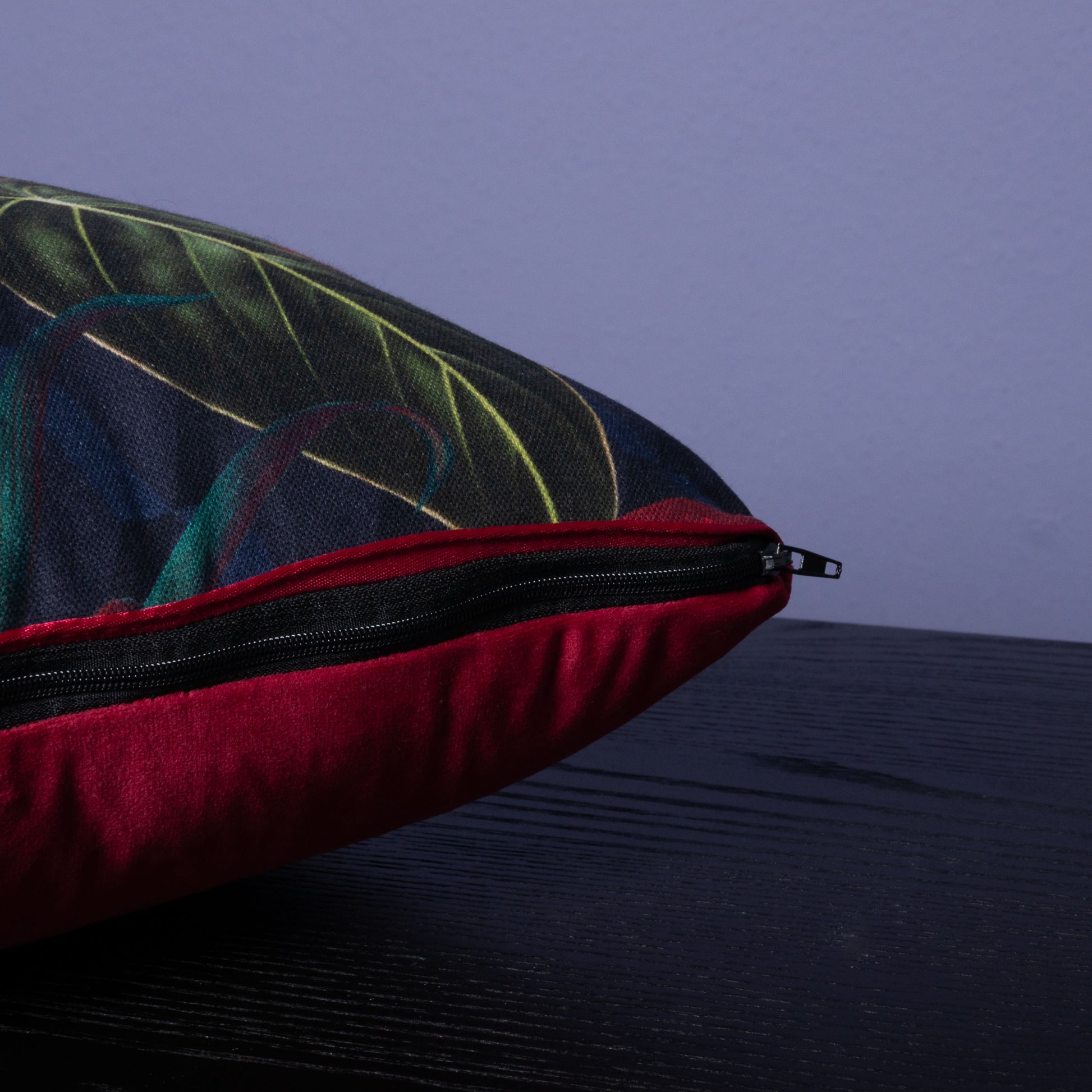 Dieses Samtkissen bringt den Zauber des erfolgreichen Regenwaldes direkt in dein Zuhause. Auf der Vorderseite entfaltet sich eine lebendige Dschungelszene mit exotischen Blättern, Blüten und einem schimmernden Vogel – schnell so, als wäre er gerade erst gelandet. Die satten Grün-, Orange- und Rottöne leuchten auf dunklem Hintergrund und verleihen dem Motiv eine faszinierende Tiefe.