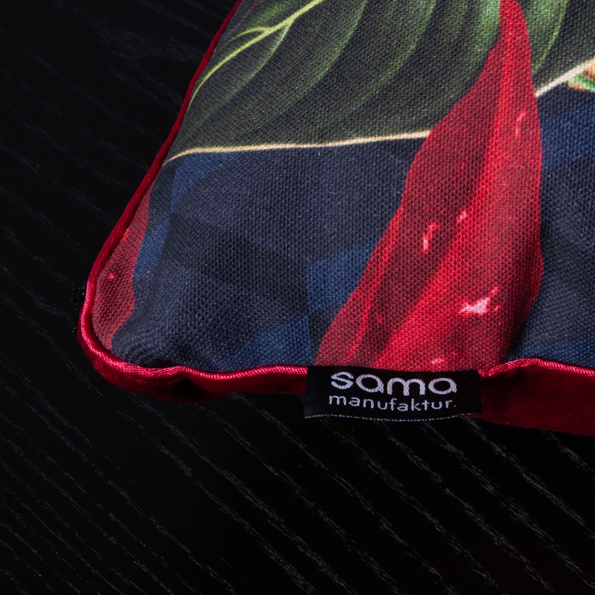 Dekokissen 40 x 40 cm Stoff Baumwollstoff Dschungel Vögel rot, Rückseite Samt rot