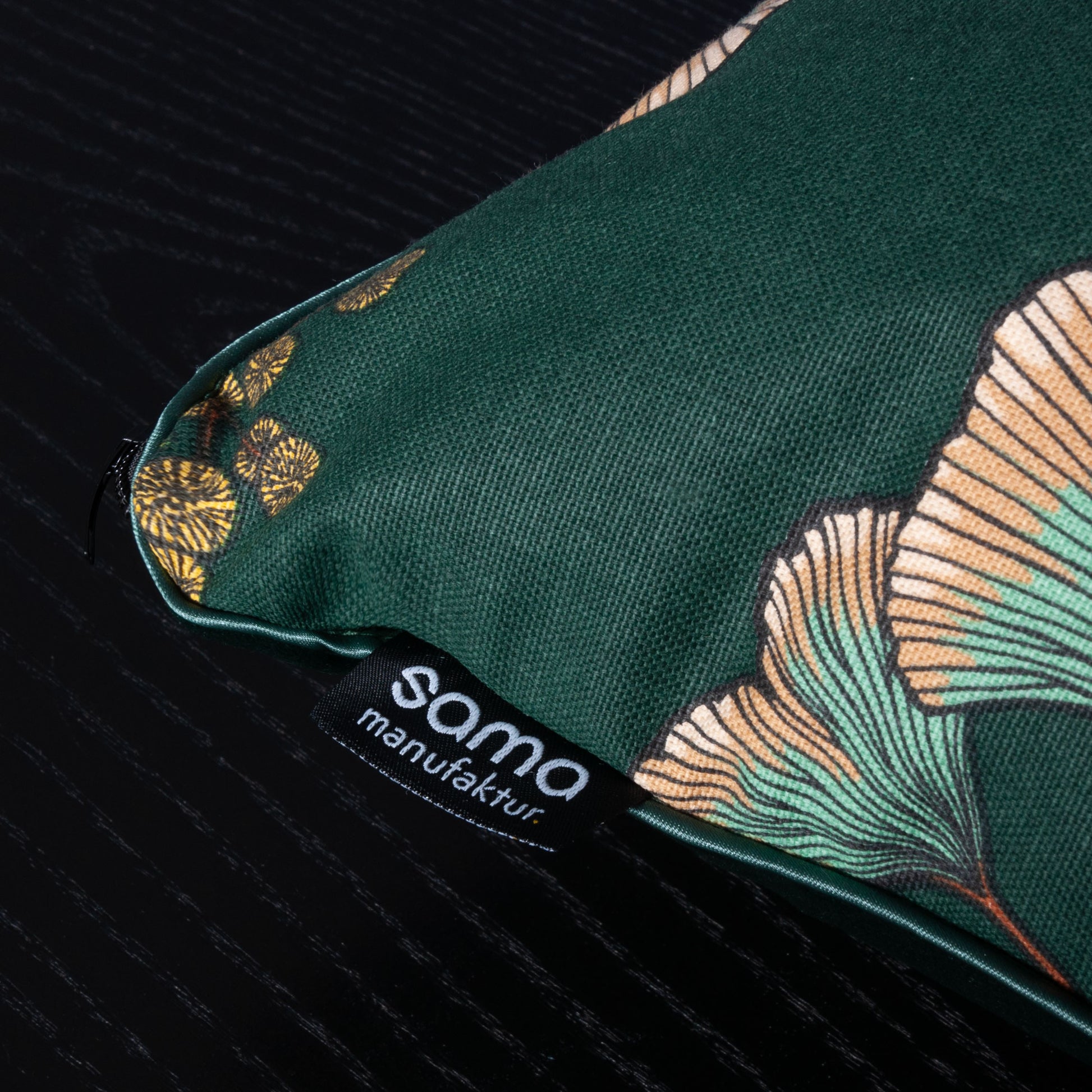 Dieses Dekokissen bringt eine stilvolle Verbindung von Natur und Design in dein Zuhause. Das detailreiche Ginkgo-Muster in sanften Grüntönen mit leuchtend gelben Akzenten erinnert an einen Spaziergang durch einen japanischen Garten im Herbst. Die tiefgrüne Samtrückseite sorgt für eine elegante und weiche Haptik – perfekt zum Entspannen.