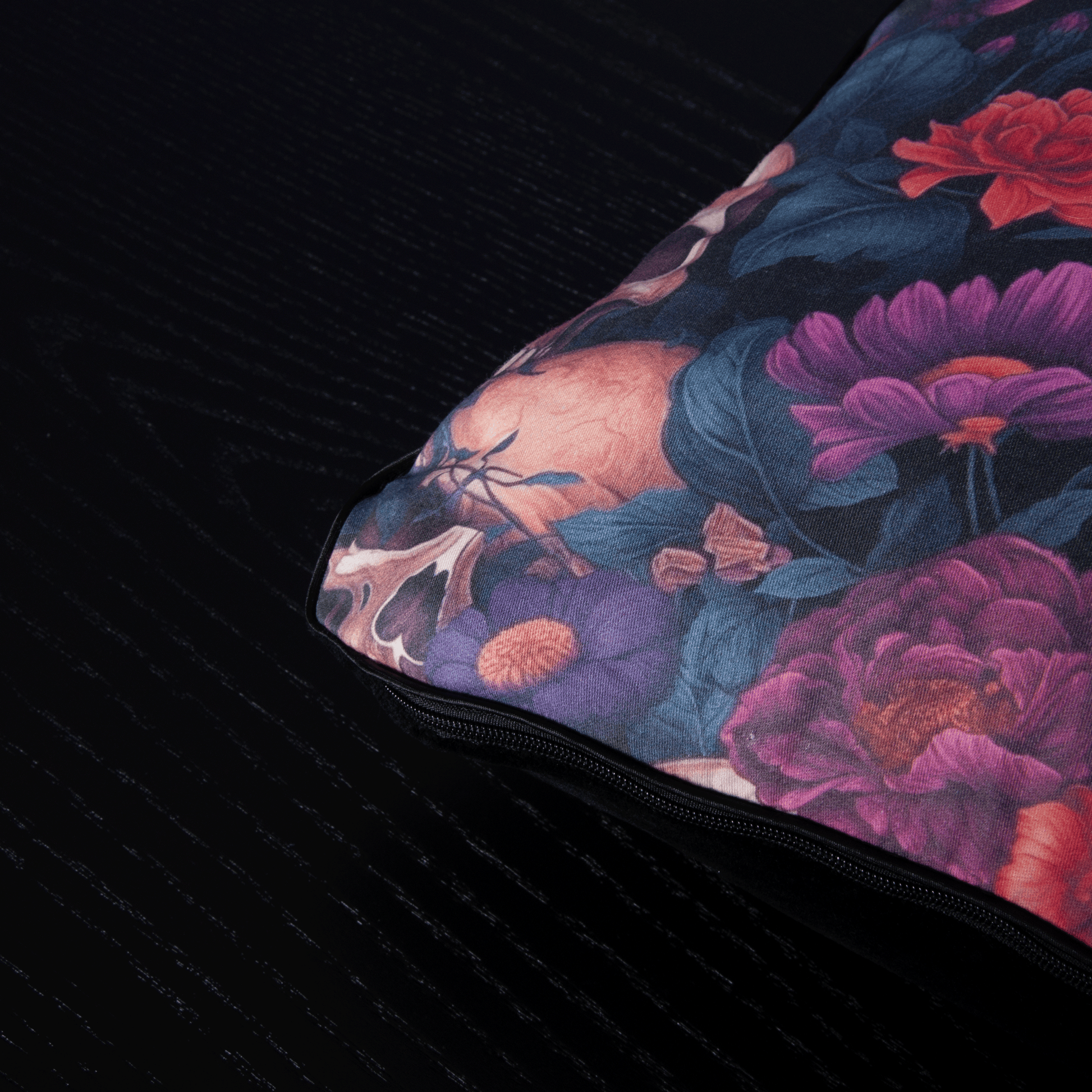 Die Rückseite in schlichtem Schwarz unterstreicht die Dramatik des Designs und macht das Kissen besonders vielseitig. Es fügt sich perfekt in moderne, düstere oder alternative Wohnstile ein und ist ein Highlight für Liebhaber außergewöhnlicher Dekoelemente. Ideal als Blickfang auf dem Sofa, im Schlafzimmer oder als stilvolle Ergänzung für eine dunkle, elegante Einrichtung.