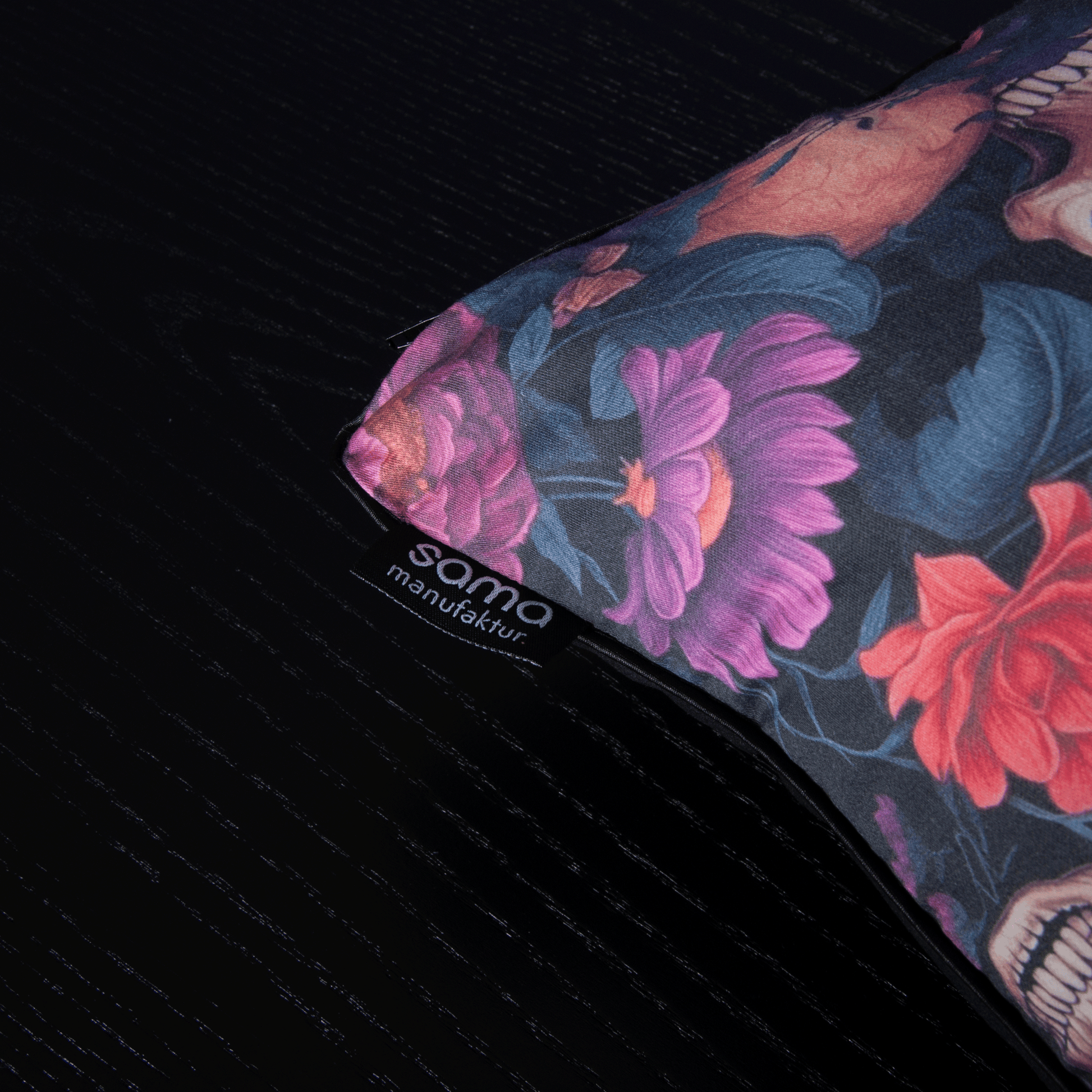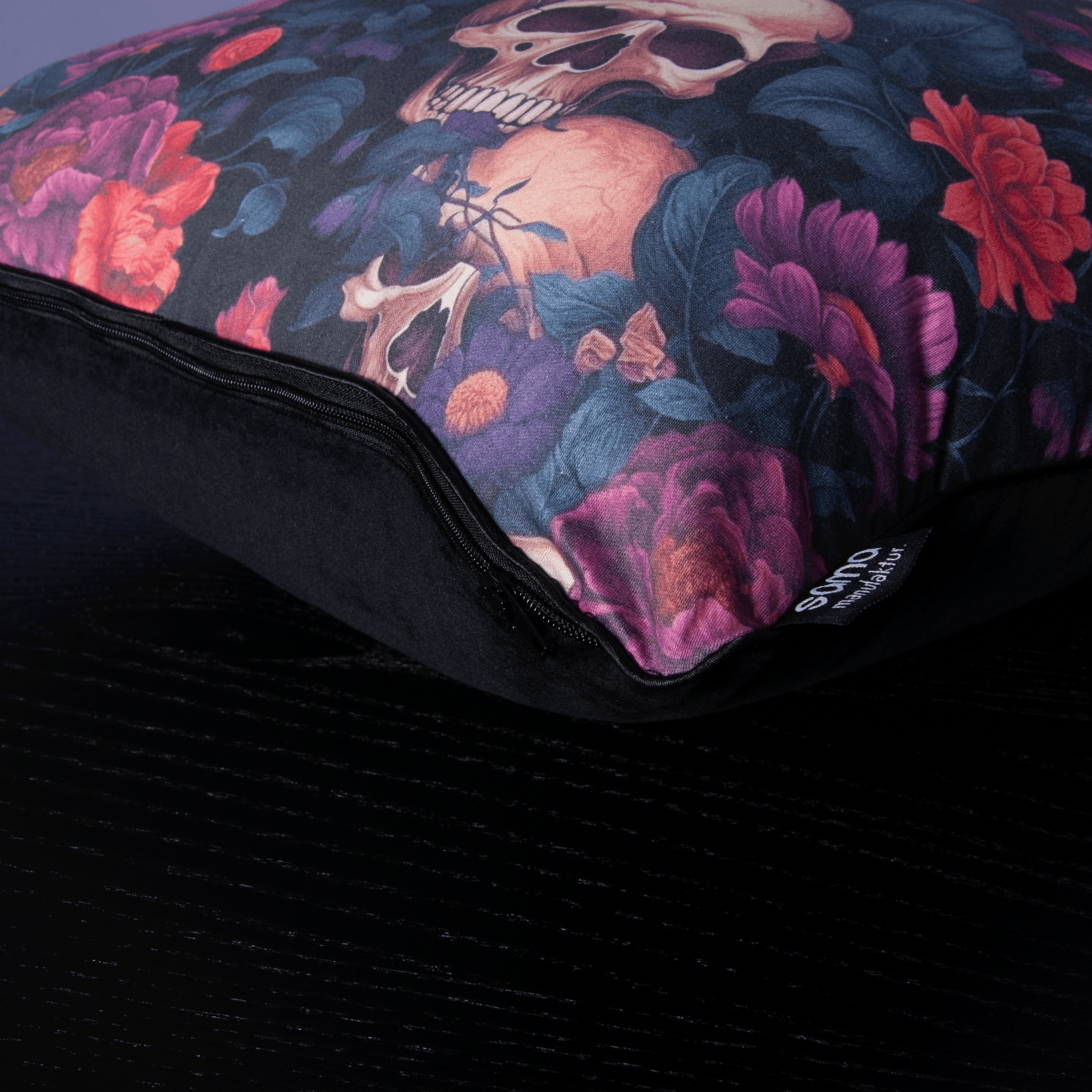 Dieses besondere Kissen setzt ein ausdrucksstarkes Statement. Das Design kombiniert kunstvolle Totenkopf-Illustrationen mit üppigen, dunklen Blüten und verleiht jedem Raum eine geheimnisvolle, schnell schon barocke Atmosphäre. Die intensiven Farben in Violett, Bordeaux und Schwarz sorgen für eine tiefe, mystische Optik, während der weiche Samtbezug für eine luxuriöse Haptik sorgt.