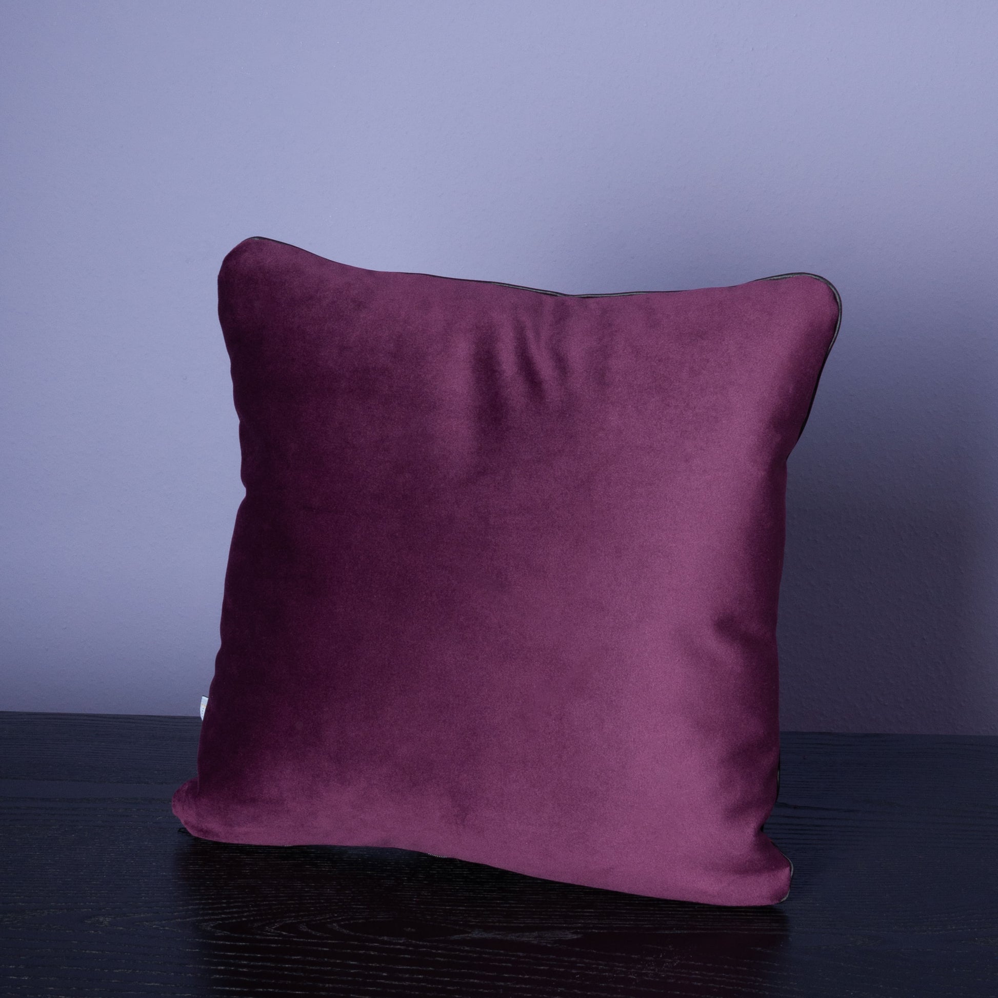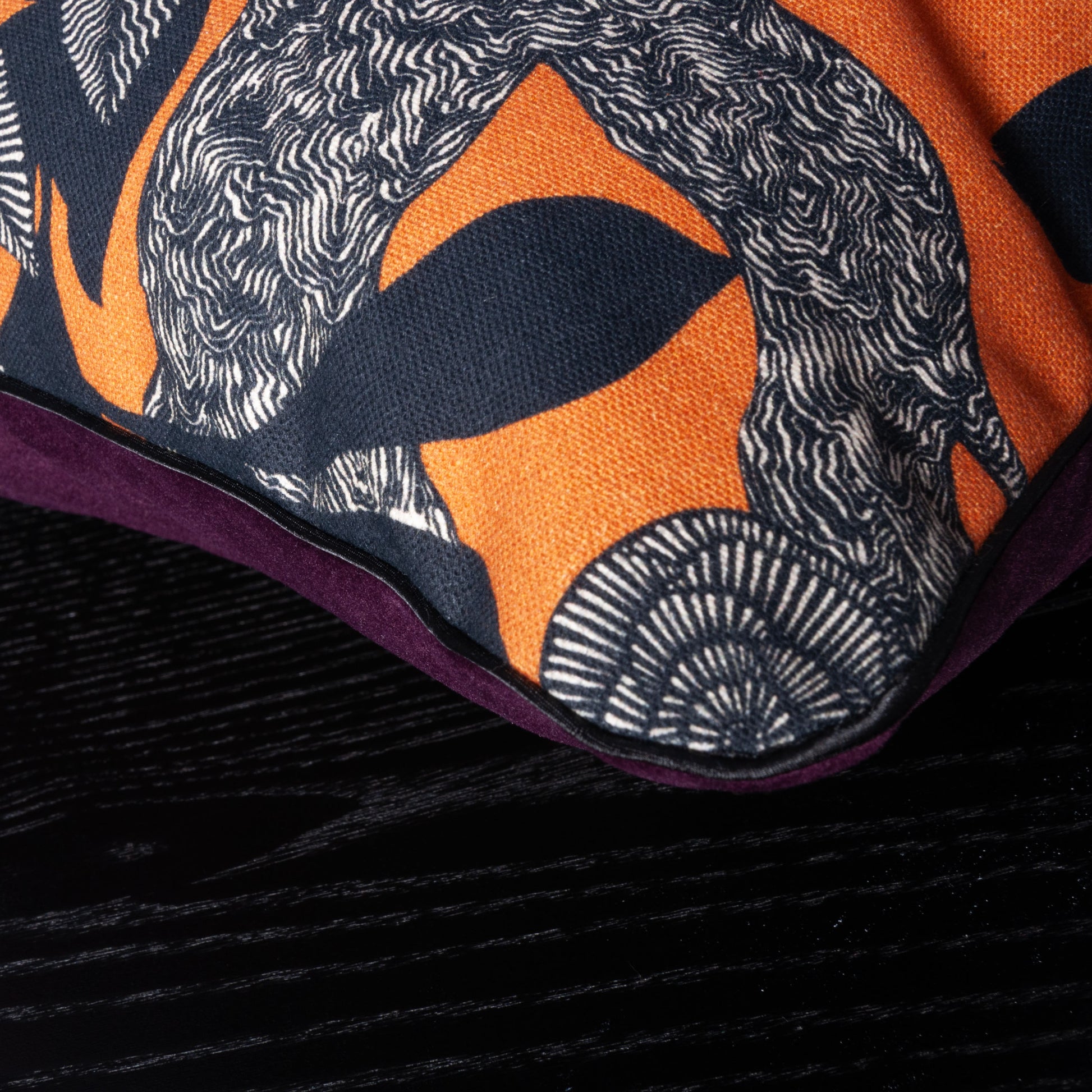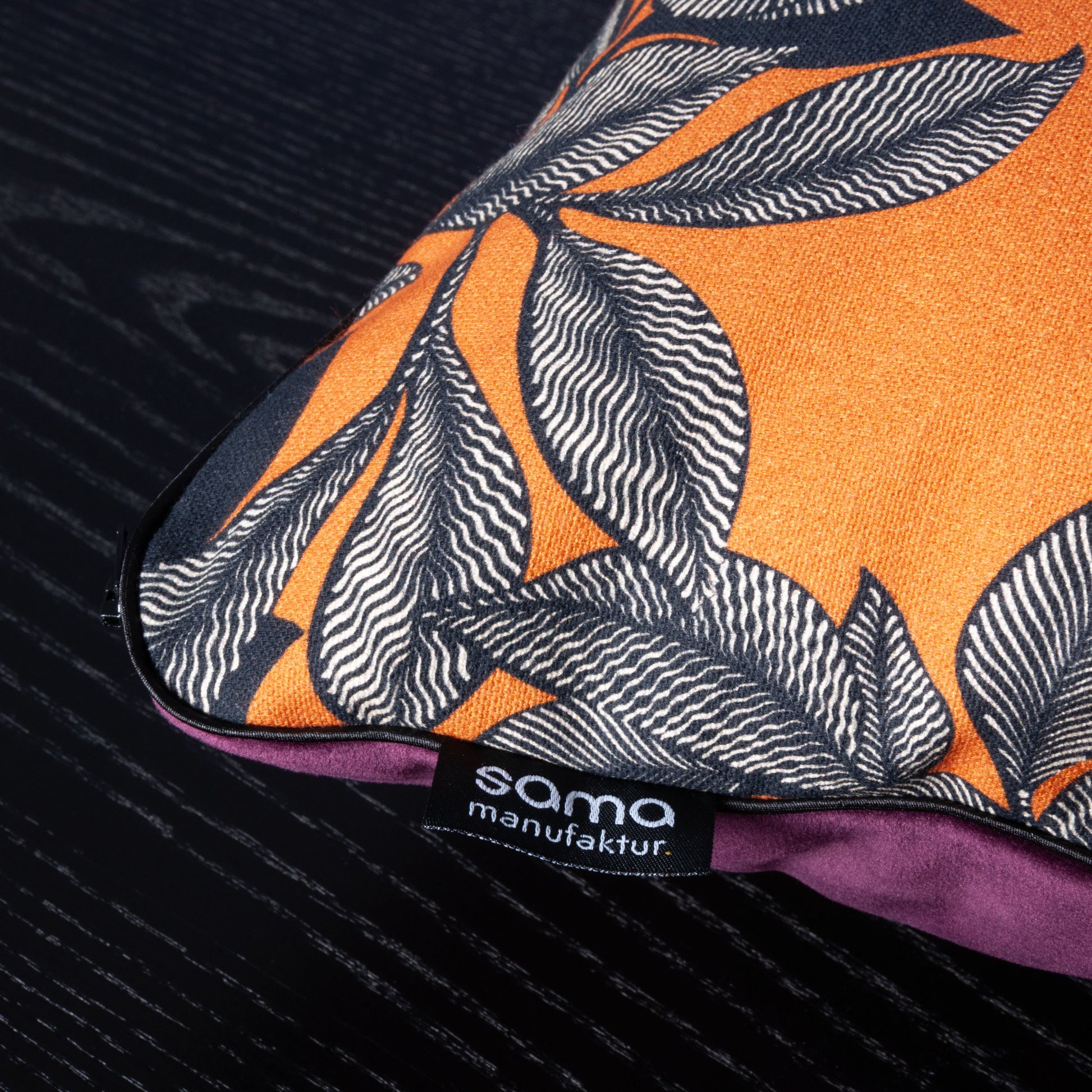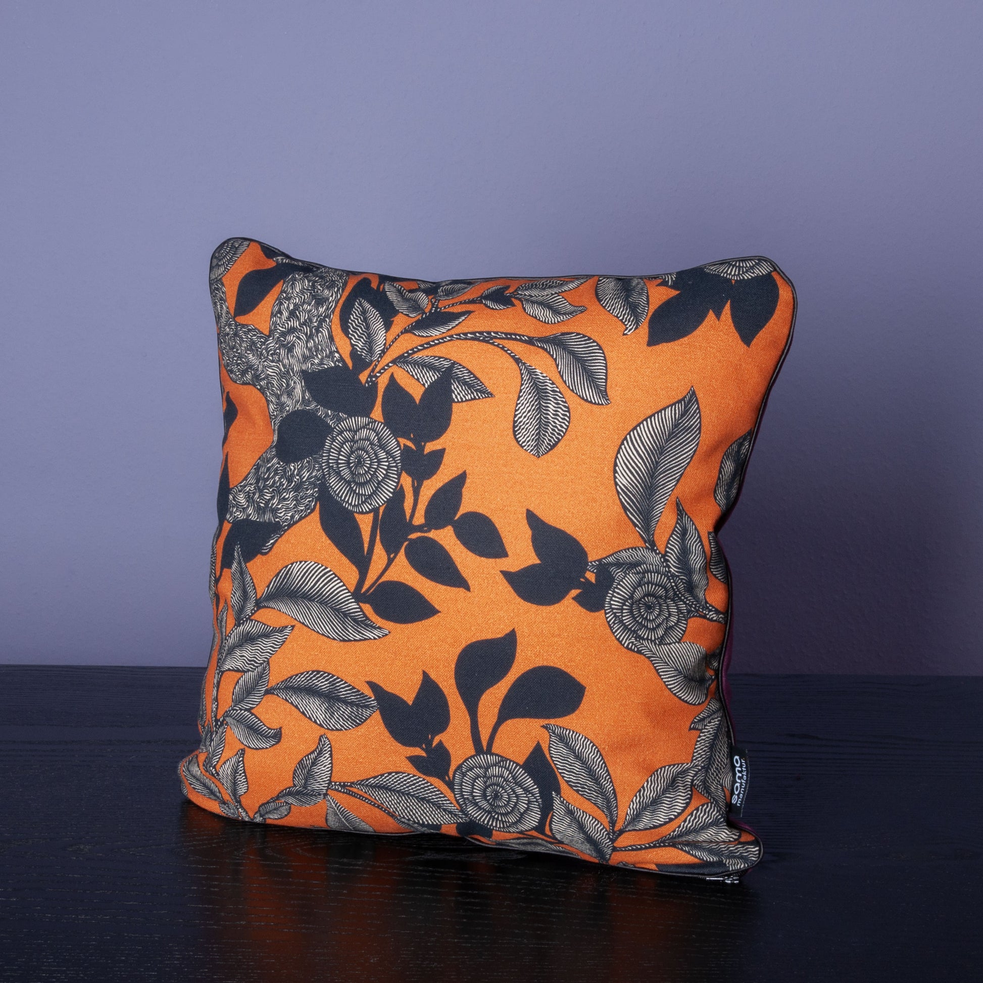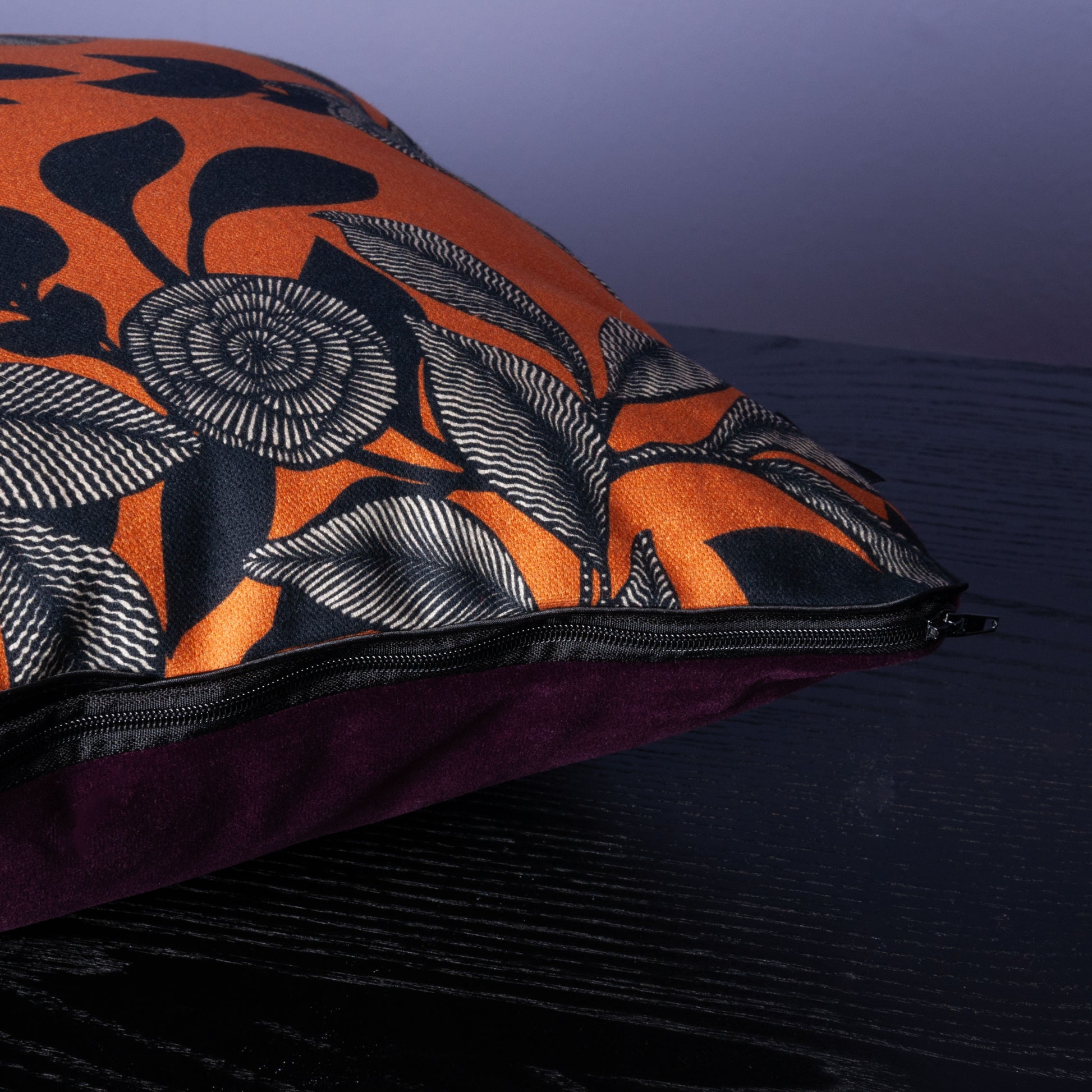 Ein Kissen mit Charakter! Das kontrastreiche Design aus tiefschwarzen Rosen und feinen Blätterranken auf leuchtendem Orange verleiht diesem Kissen eine ausdrucksstarke, schnelle grafische Ästhetik. Die samtige Rückseite in edlem Violett ergänzt das Design mit einer luxuriösen Note. Dieses Kissen passt perfekt in moderne, eklektische oder von Art Déco inspirierte Wohnräume und setzt stilvolle Akzente auf Sofas, Sesseln oder Betten. Ein echter Blickfang für alle, die markante Designs und ausdrucksstarke Farben lieben!