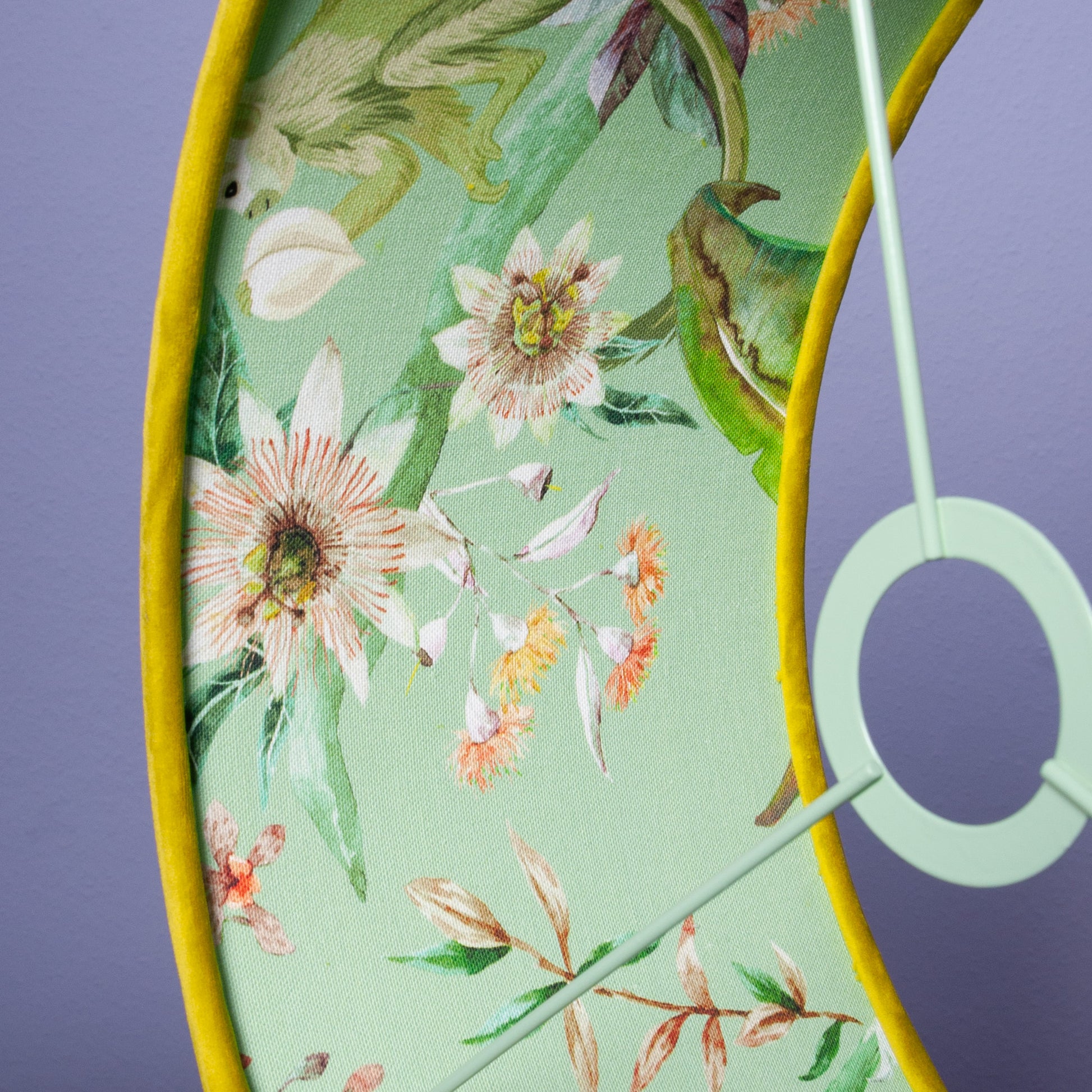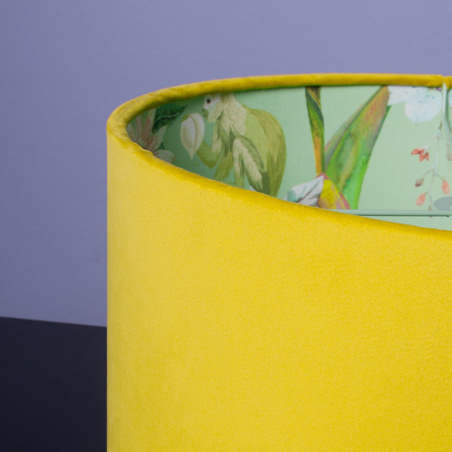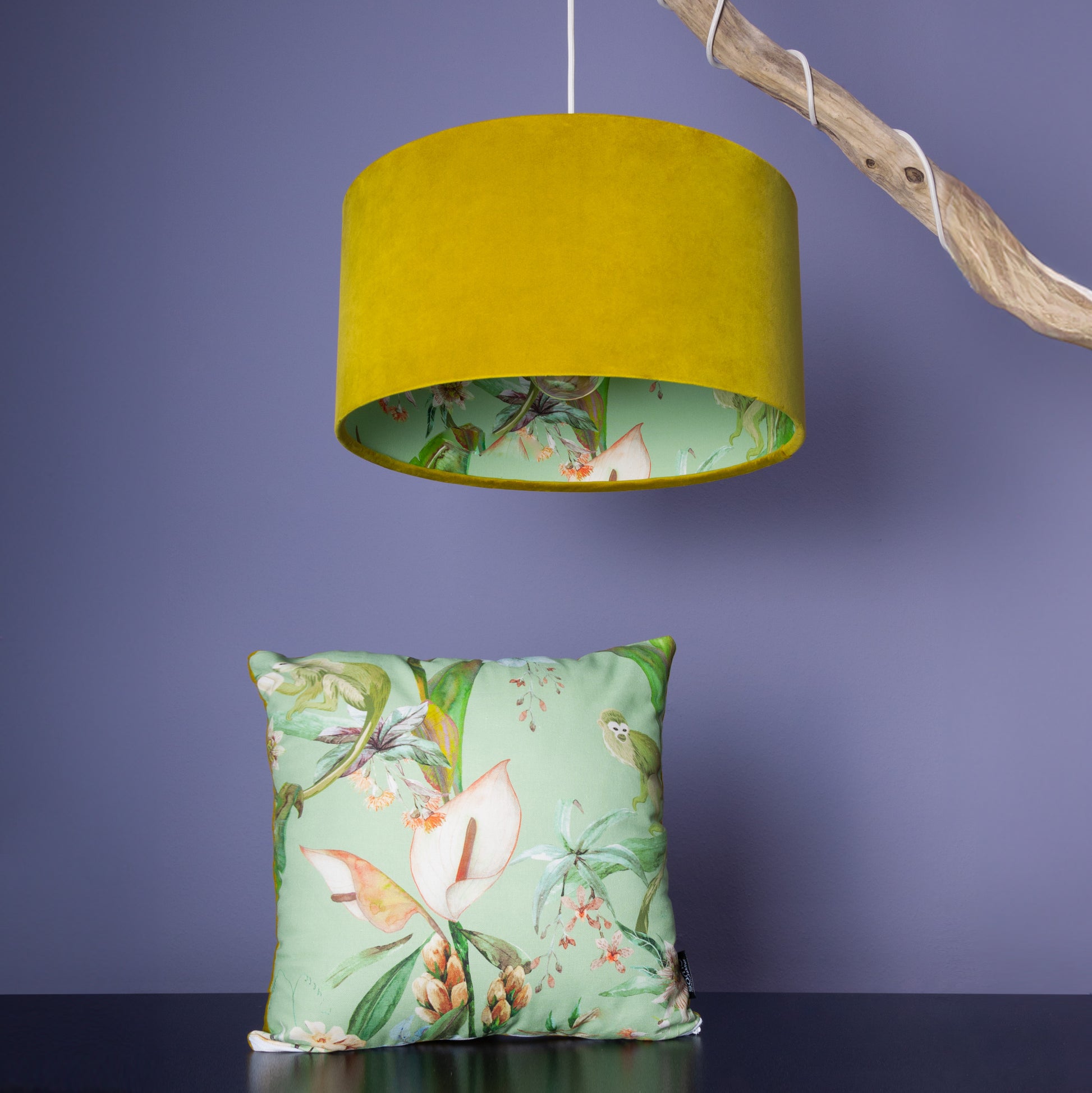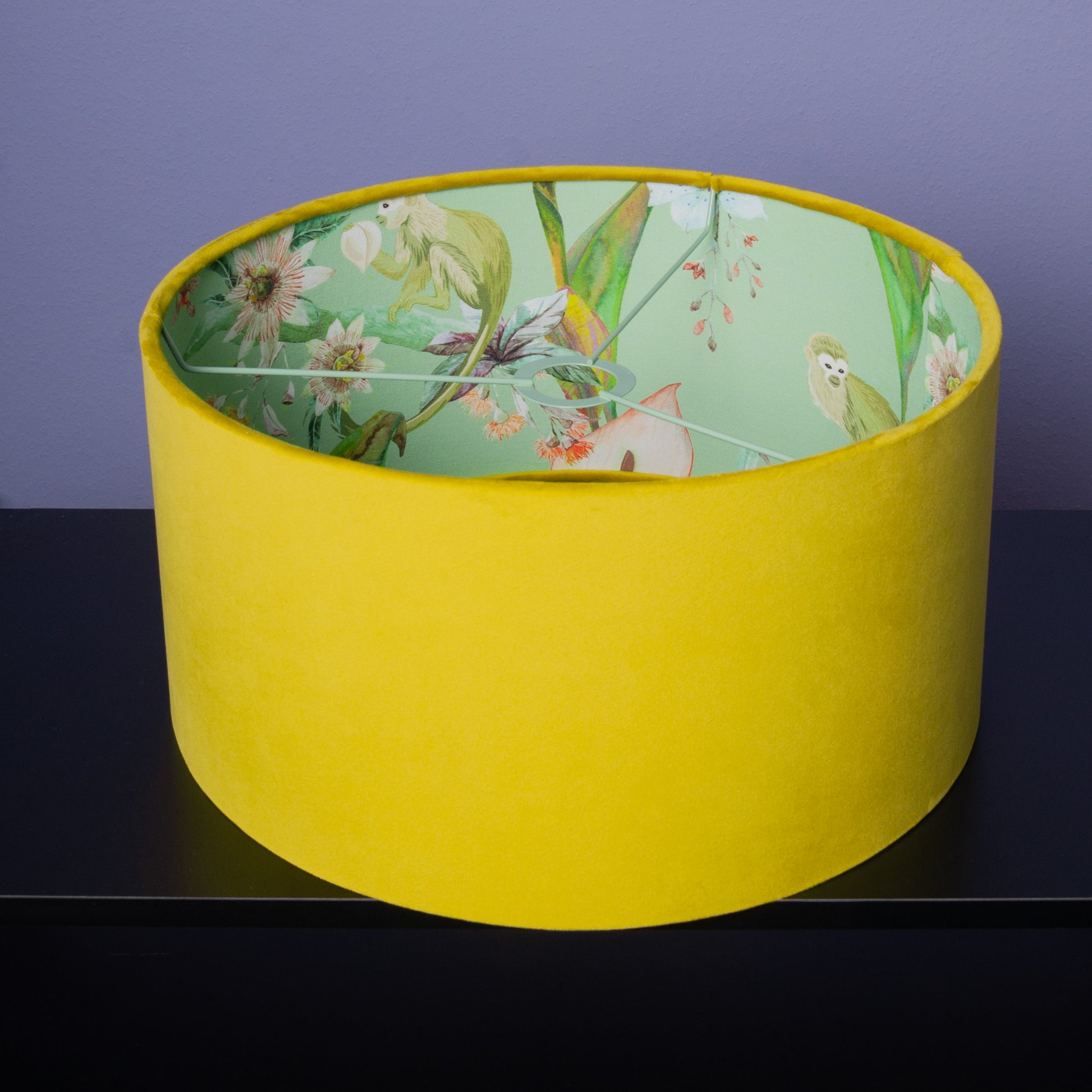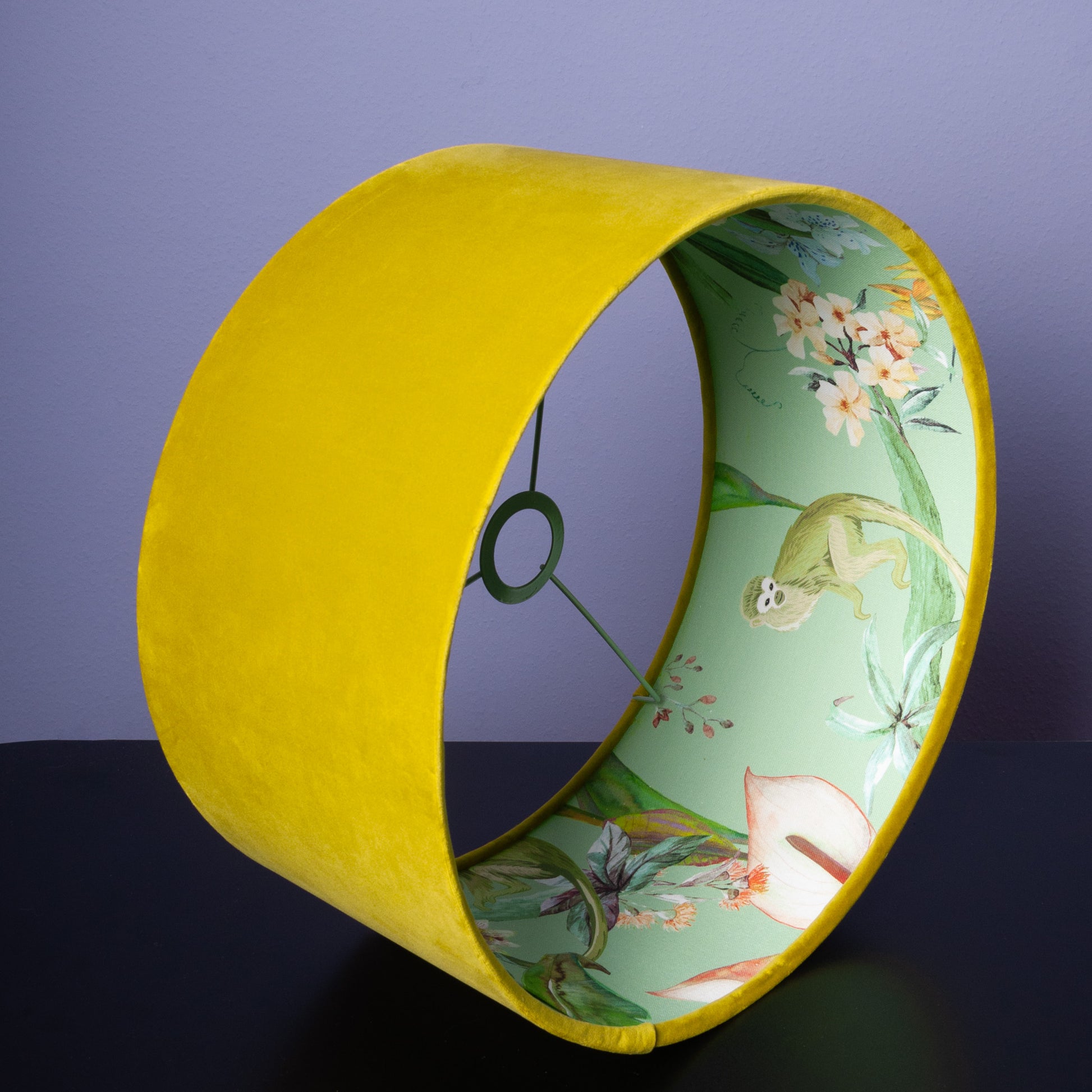 Dieser Lampenschirm aus Samtstoff bringt Leichtigkeit und frische Farbe in deine Räume! Die edle senfgelbe Samt-Außenseite strahlt Wärme und Modernität aus, während das Innere mit einem detailreichen Muster auf Mintgrün überrascht. Kleine Affen und exotische Blätter verleihen diesem Design eine verspielte, aber dennoch stilvolle Note.