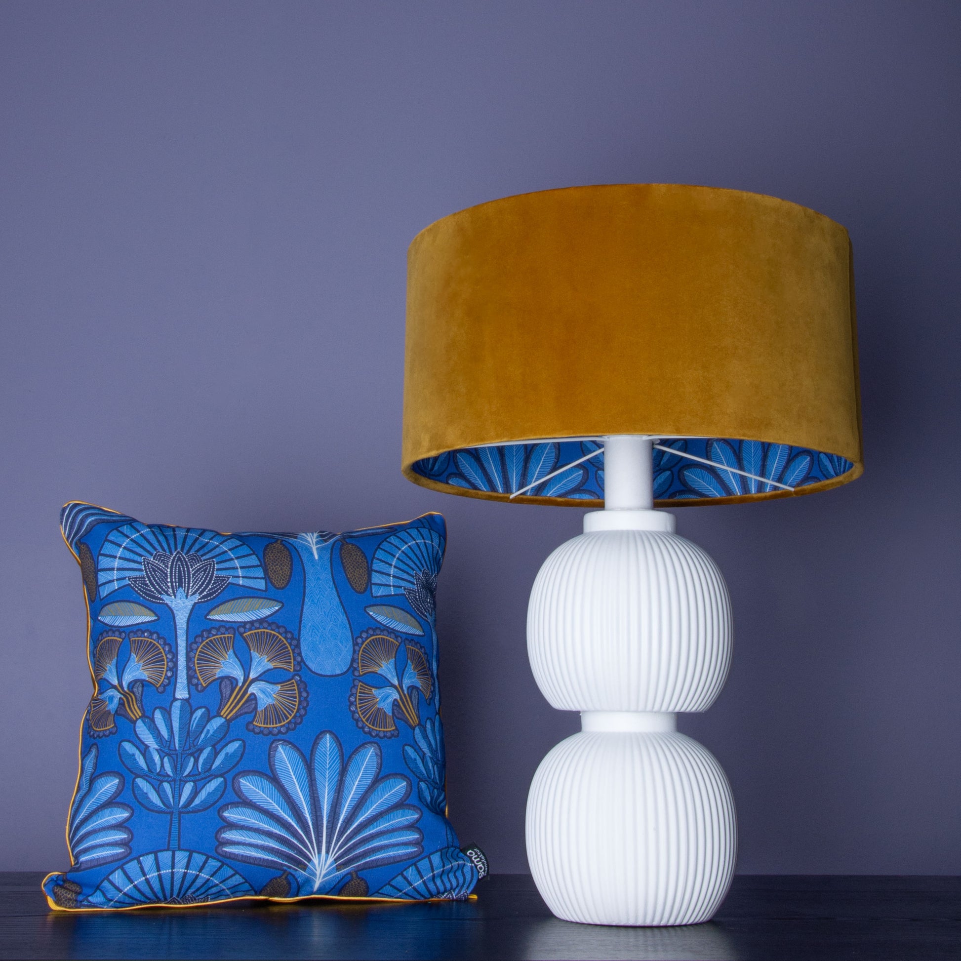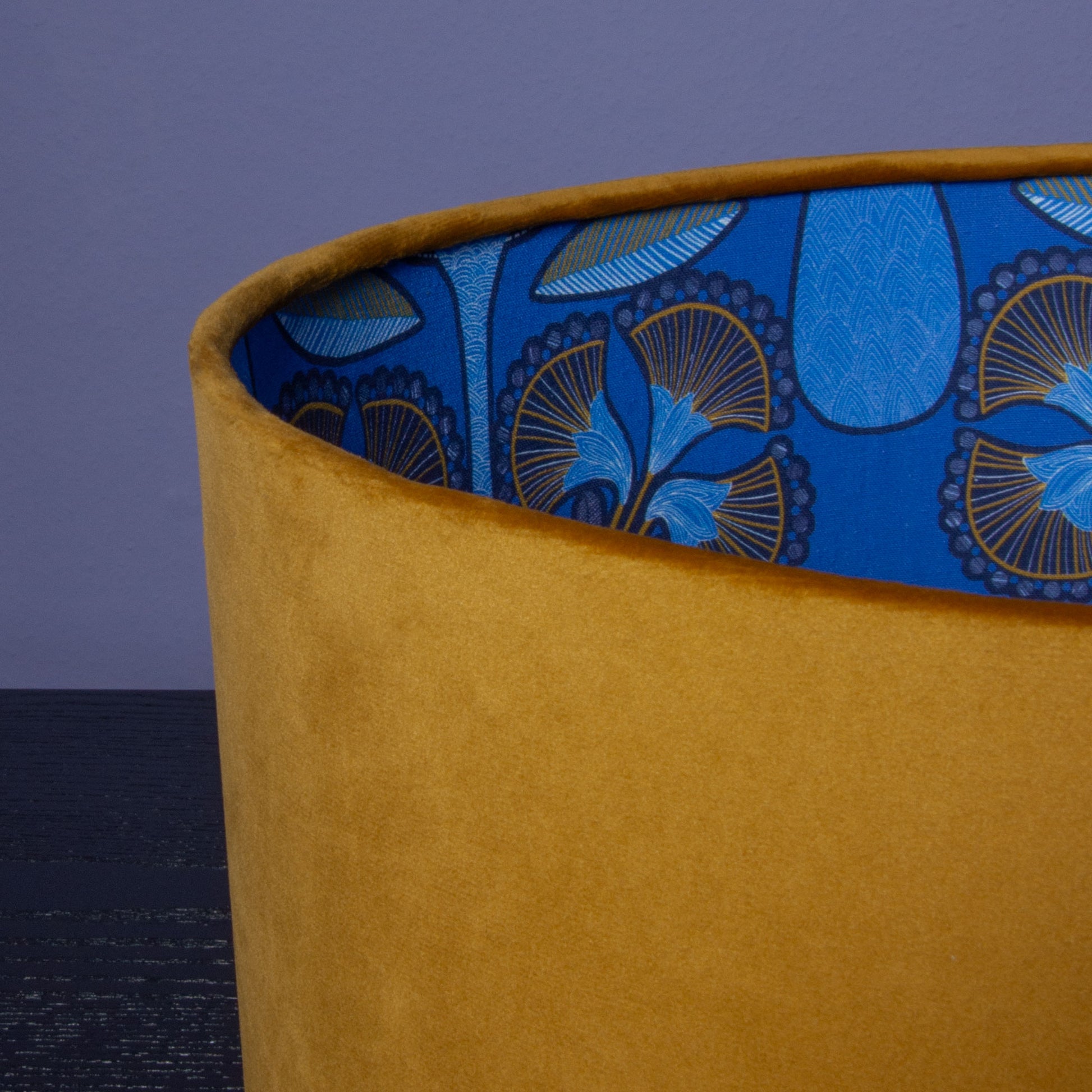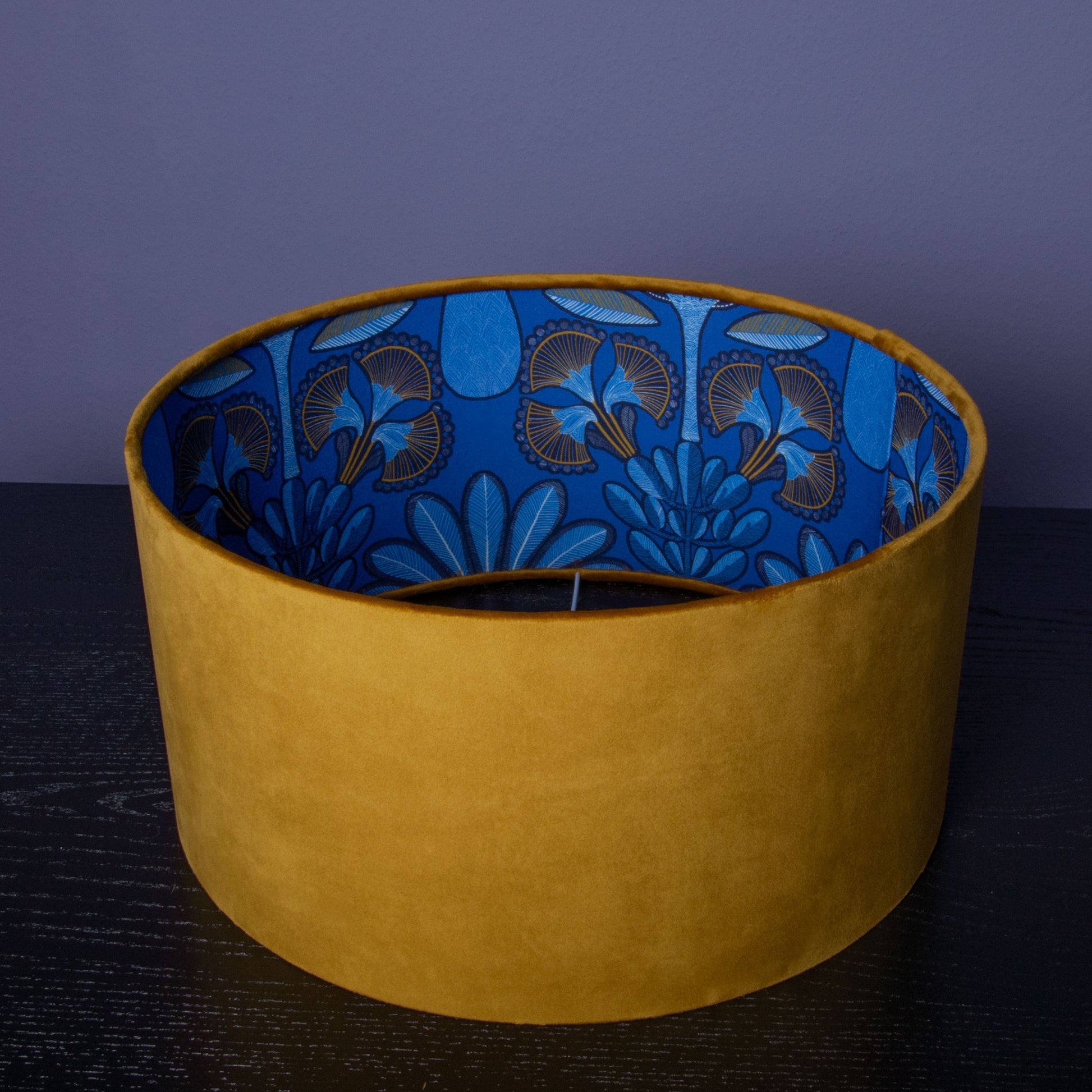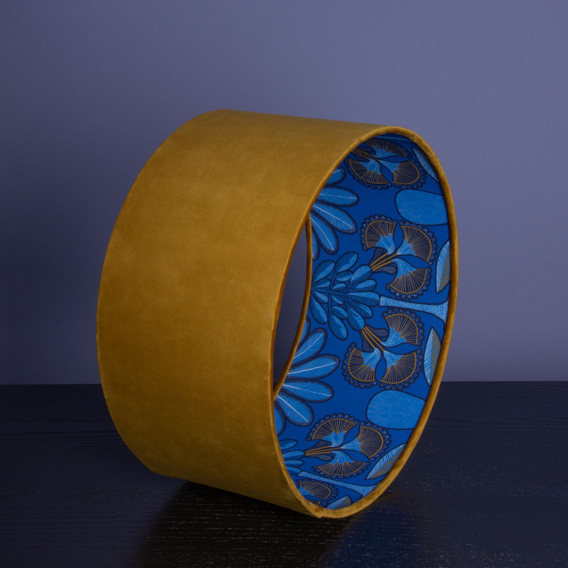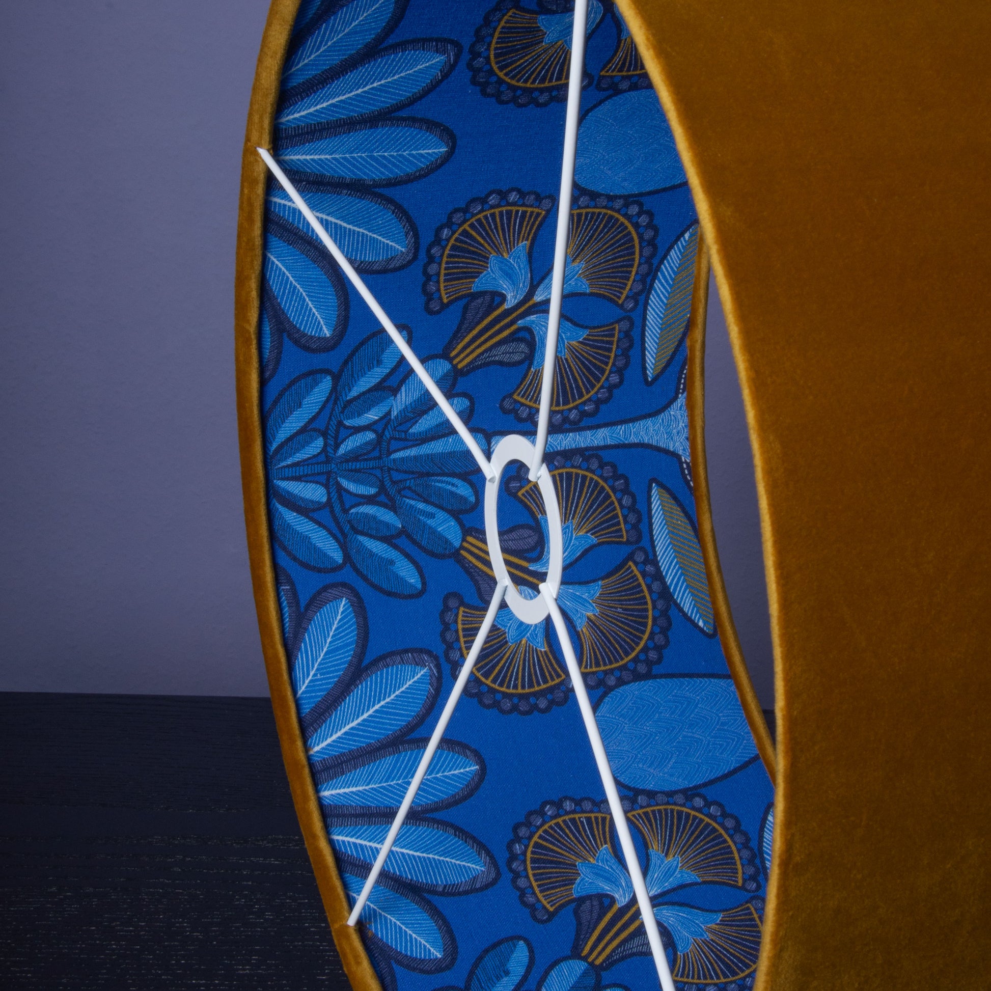 Bringe mit diesem Lampenschirm aus Samtstoff einen Hauch von afrikanischem Ethno-Chic in dein Zuhause! Die edle karamellfarbene Außenseite sorgt für eine warme, luxuriöse Atmosphäre, während das blaue Innenmuster mit abstrakten Blättern an traditionelle afrikanische Muster erinnert.