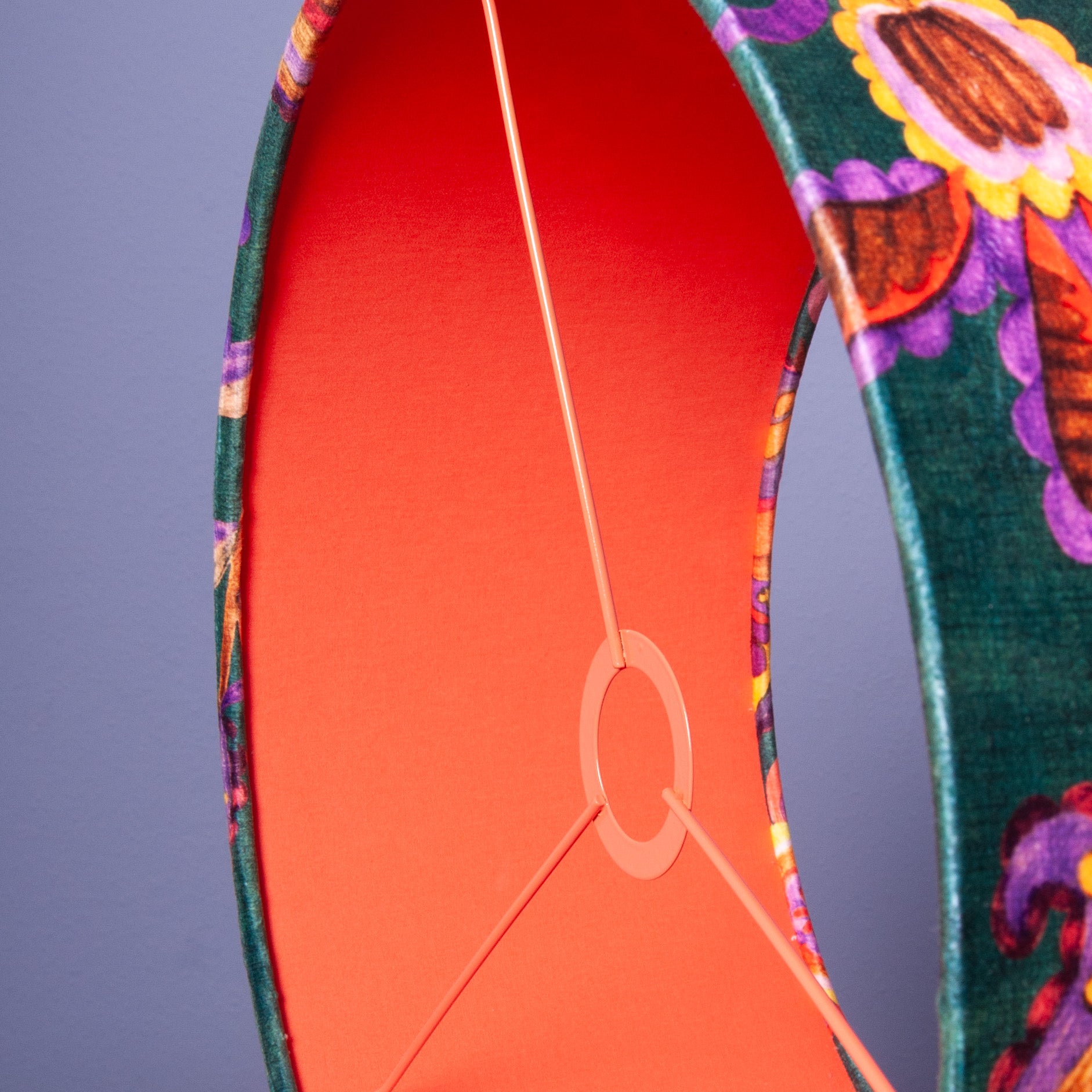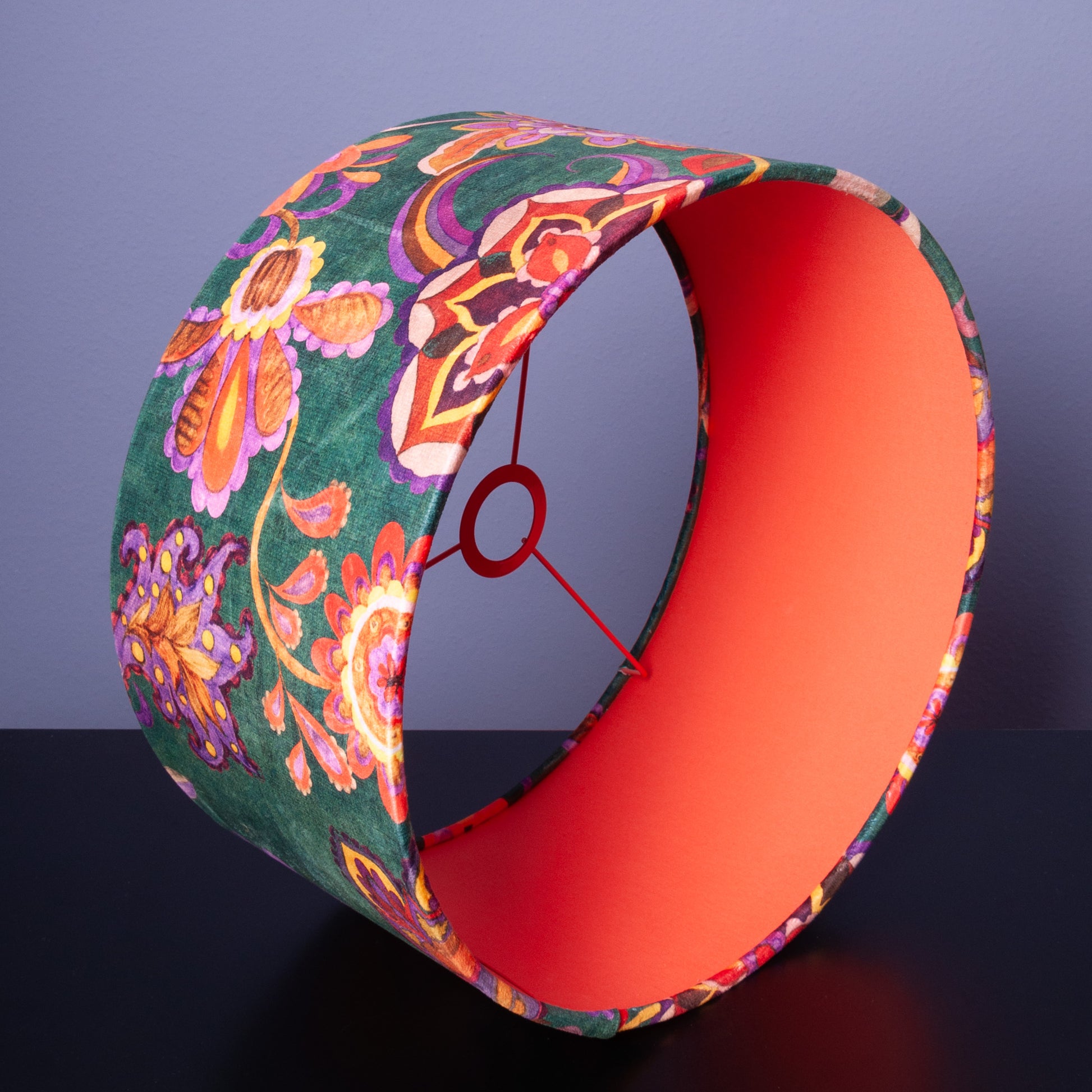 Bringe mit diesem Lampenschirm aus Samtstoff ein echtes Statement-Stück in dein Zuhause! Der tiefpetrolgrüne Samtstoff mit seinem opulenten floralen Muster in Orange, Lila und Rot verleiht jedem Raum eine warme, lebendige Ausstrahlung. Die leuchtend orangefarbene Innenseite sorgt für ein gemütliches, warmes Licht – perfekt für eine stimmungsvolle Atmosphäre.