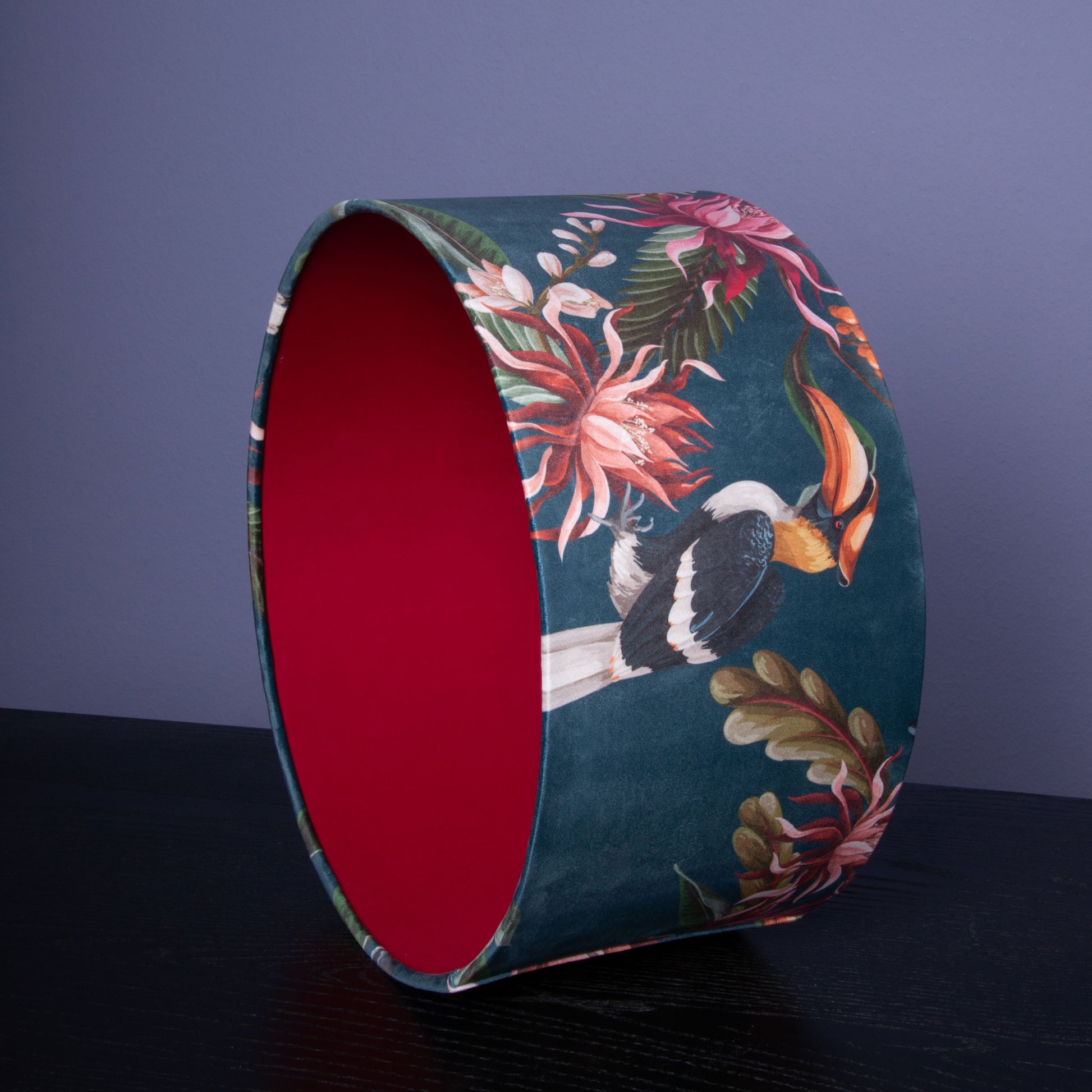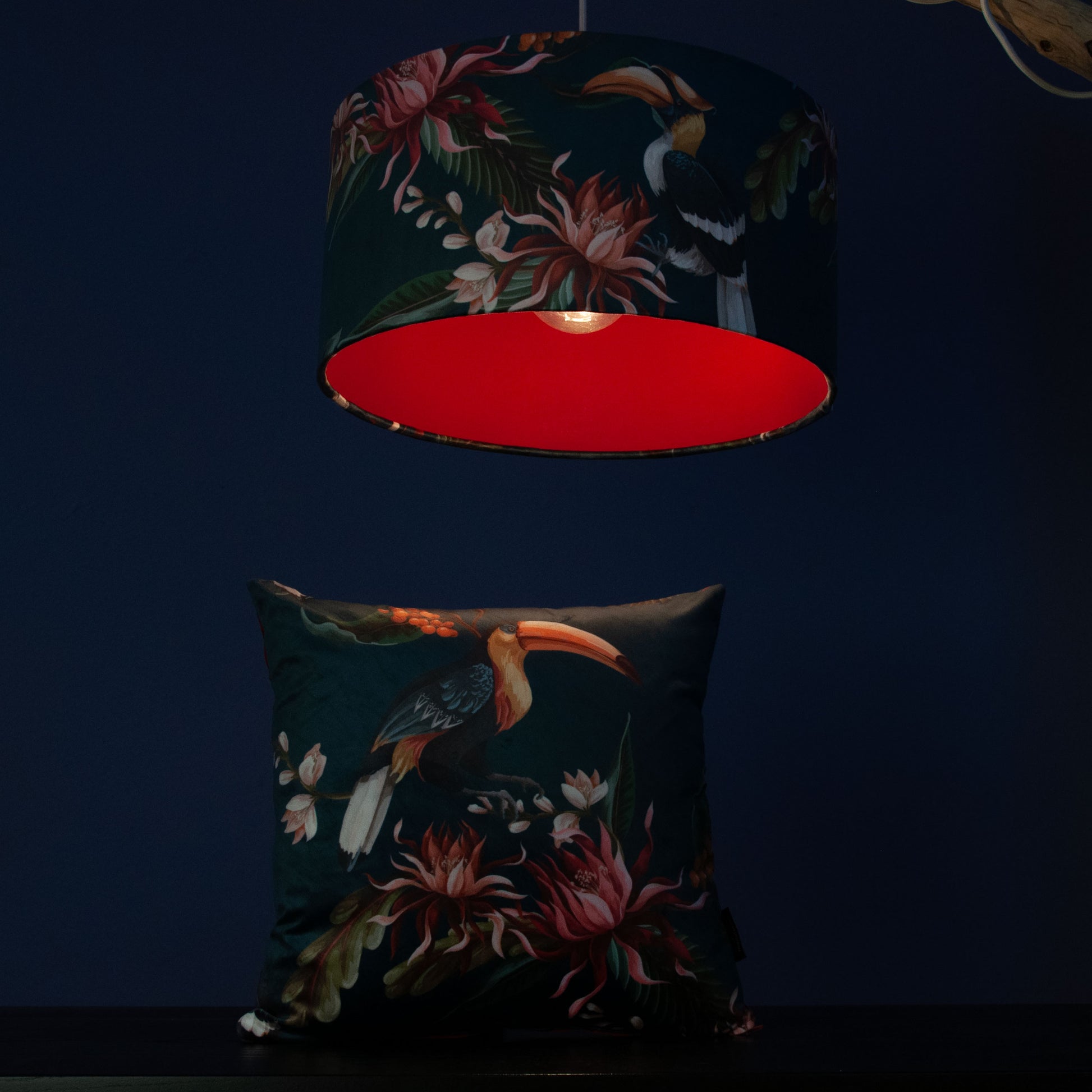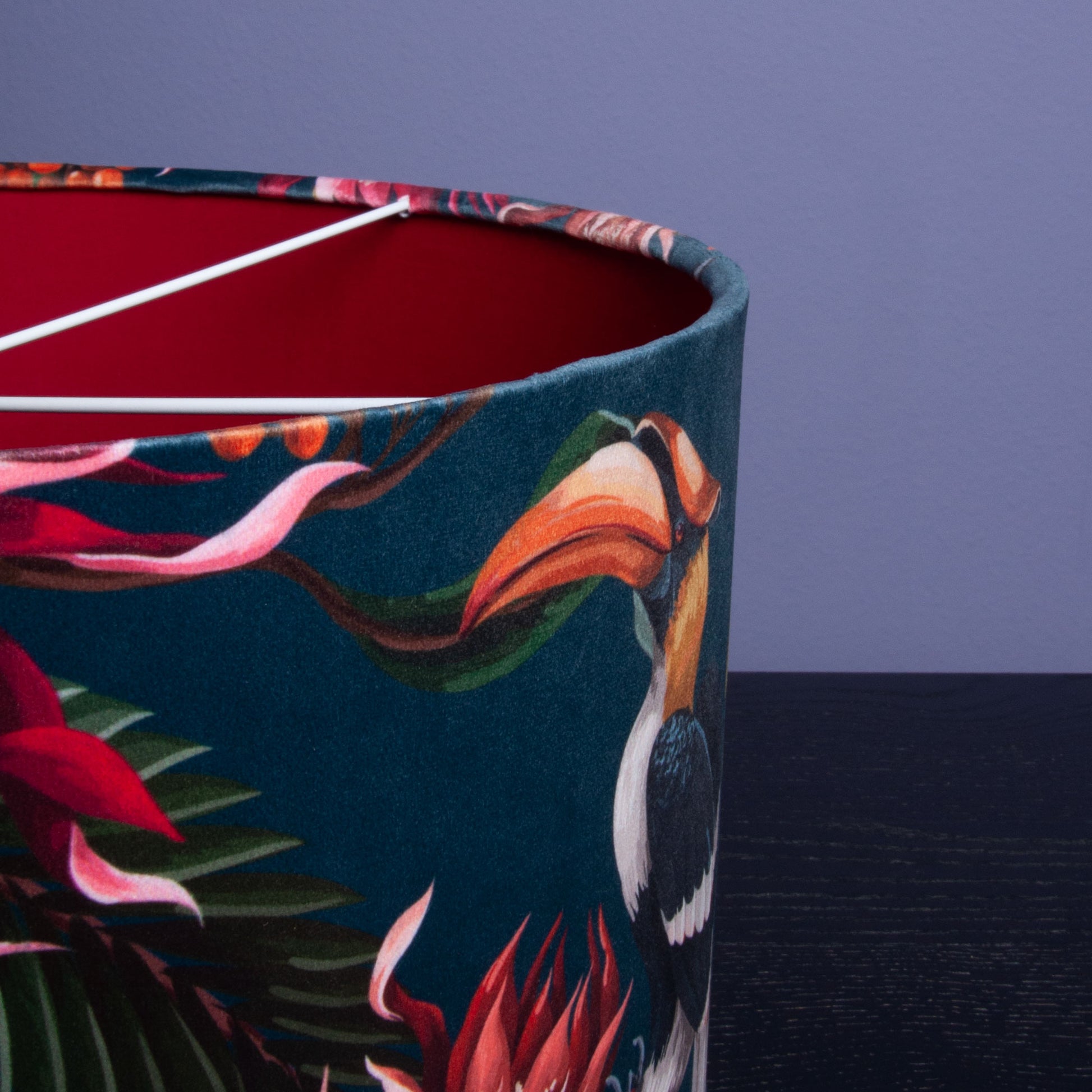 Bringe mit diesem Lampenschirm aus Samtstoff einen Hauch von Tropenflair in dein Zuhause! Das detailreiche Tukan-Design auf edlem Blaugrau kombiniert exotische Pflanzen und lebendige Farben zu einem echten Blickfang. Die kräftige rote Innenseite sorgt für ein warmes, gemütliches Licht und setzt einen stilvollen Kontrast.