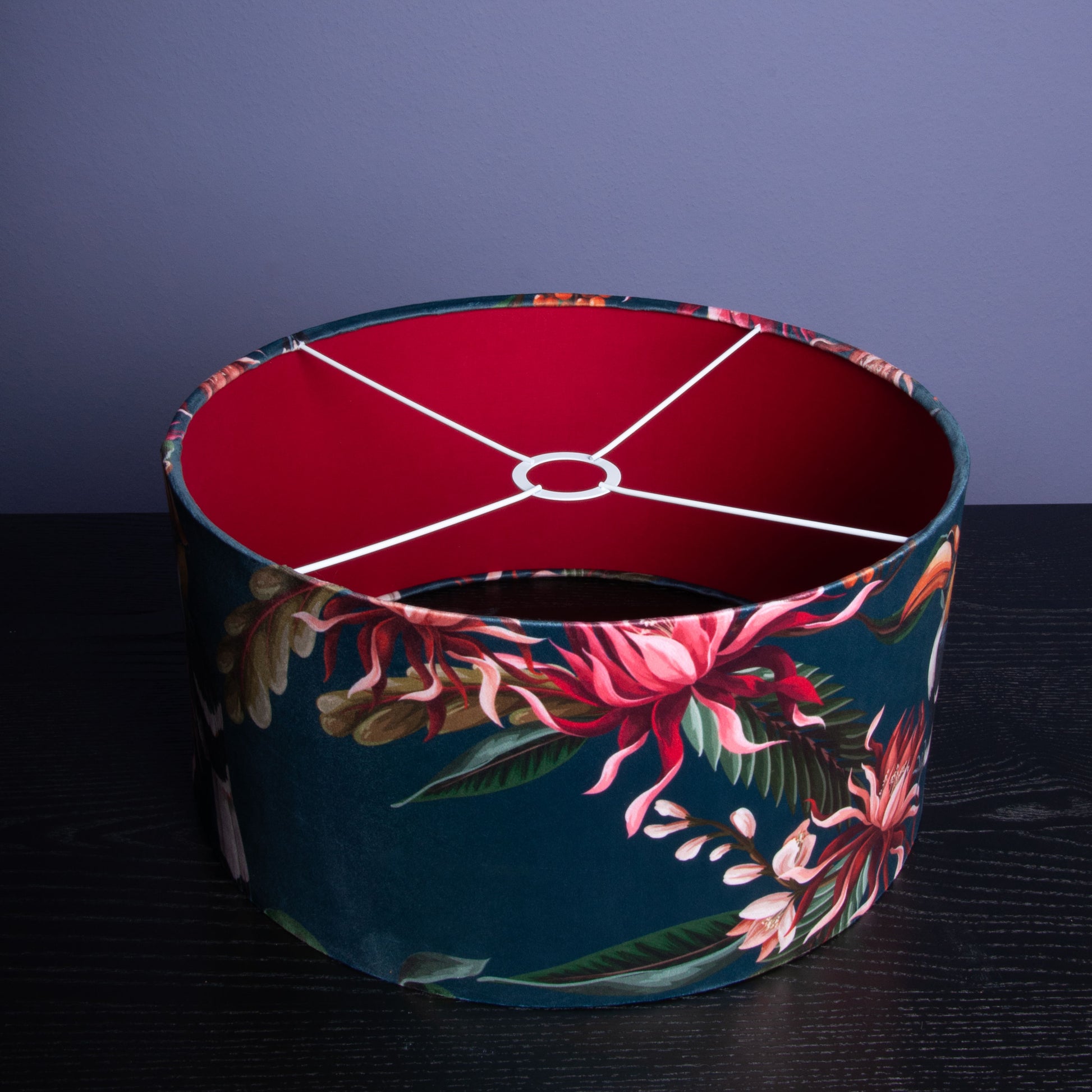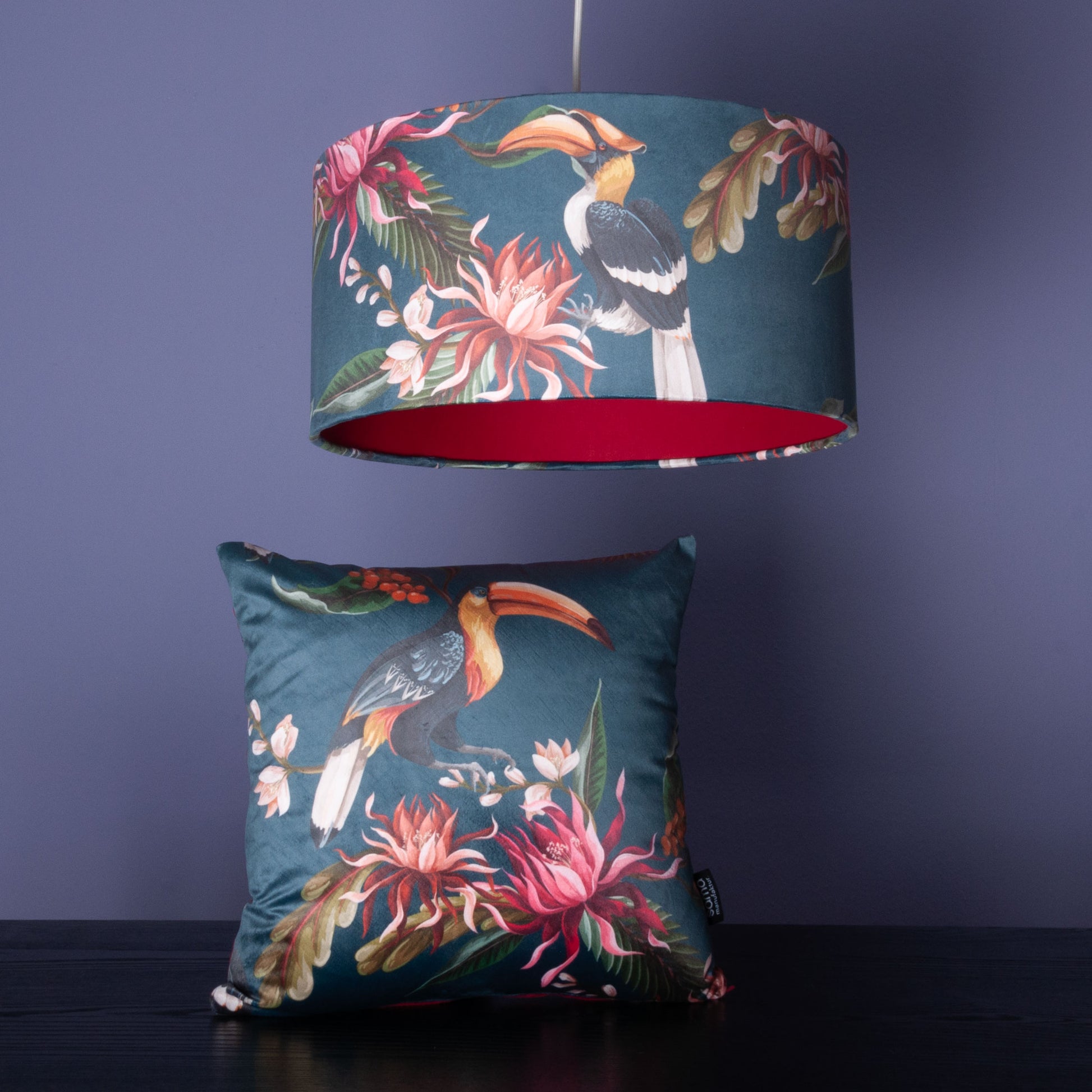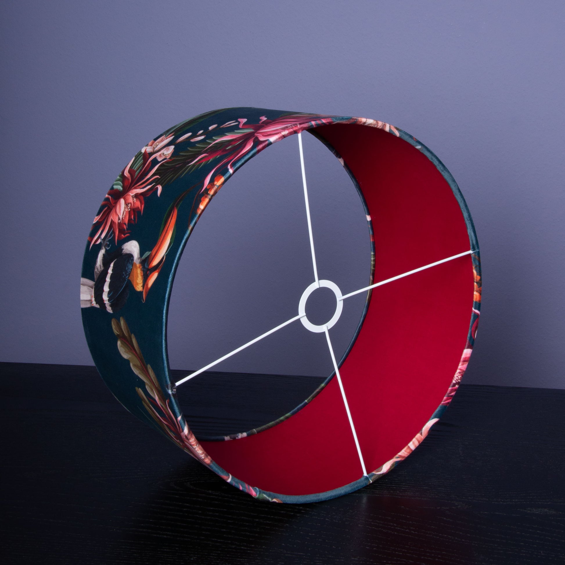 Bringe mit diesem Lampenschirm aus Samtstoff einen Hauch von Tropenflair in dein Zuhause! Das detailreiche Tukan-Design auf edlem Blaugrau kombiniert exotische Pflanzen und lebendige Farben zu einem echten Blickfang. Die kräftige rote Innenseite sorgt für ein warmes, gemütliches Licht und setzt einen stilvollen Kontrast.