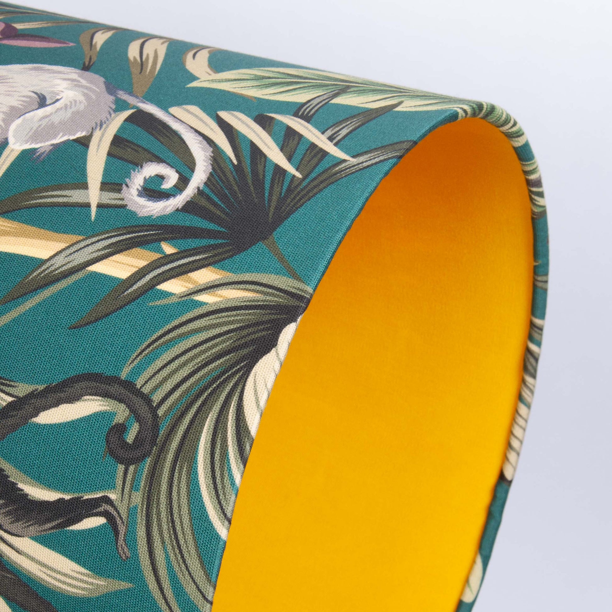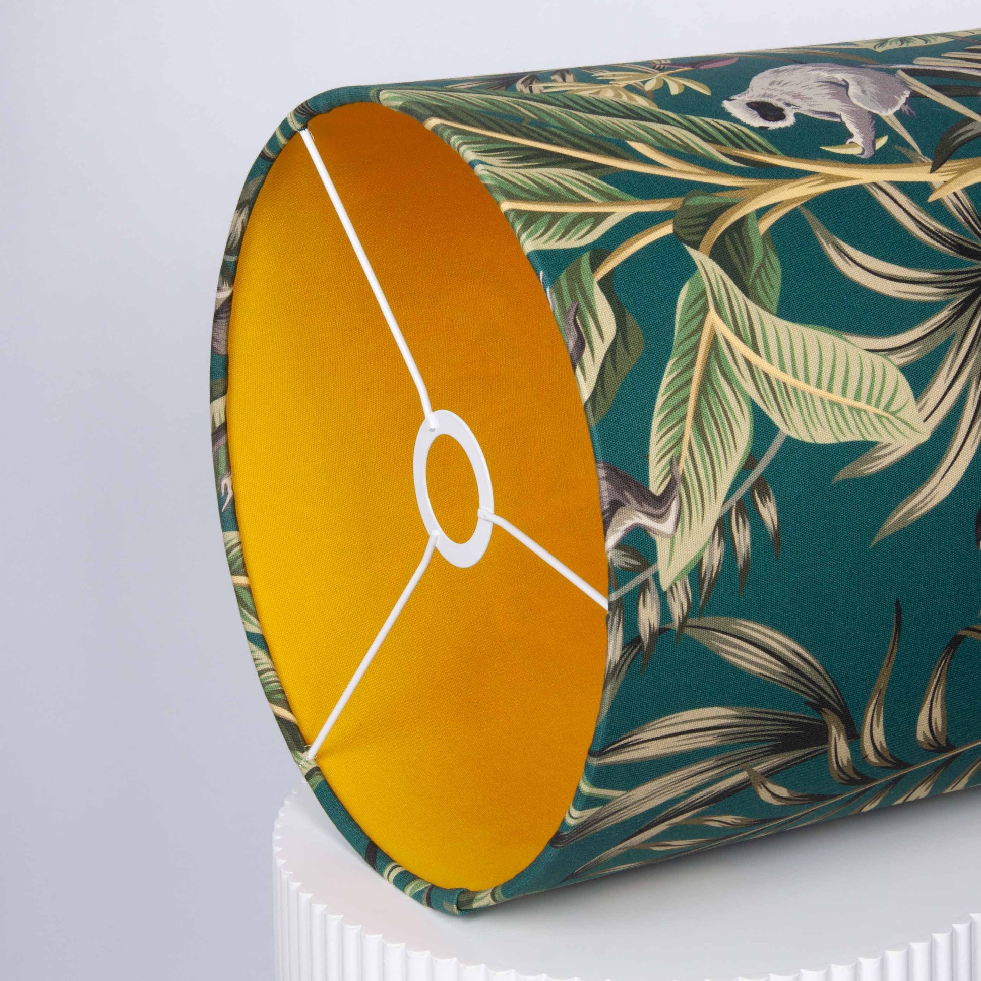 Das Motiv zeigt eine Dschungellandschaft mit Blättern und verspielten Äffchen. Im Inneren ist ein gelber Stoff verarbeitet, der das Licht warm reflektiert.